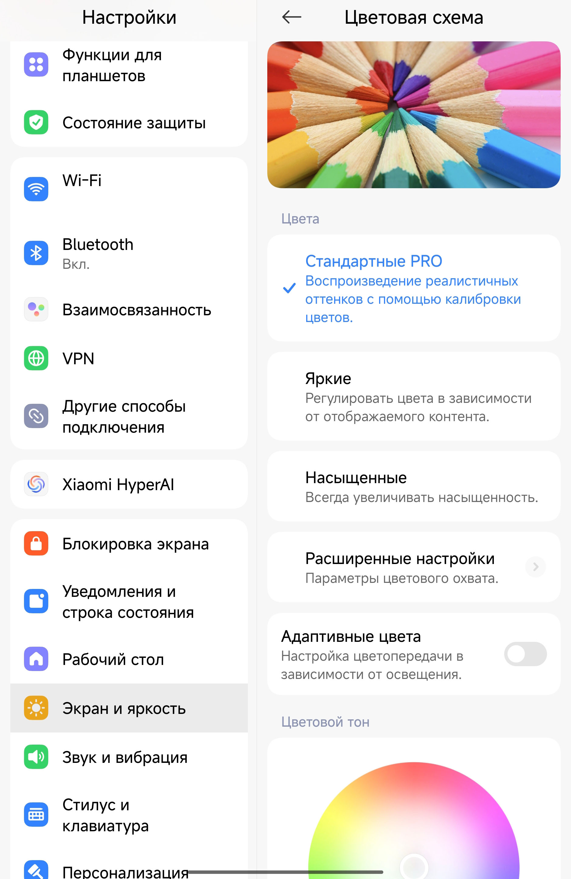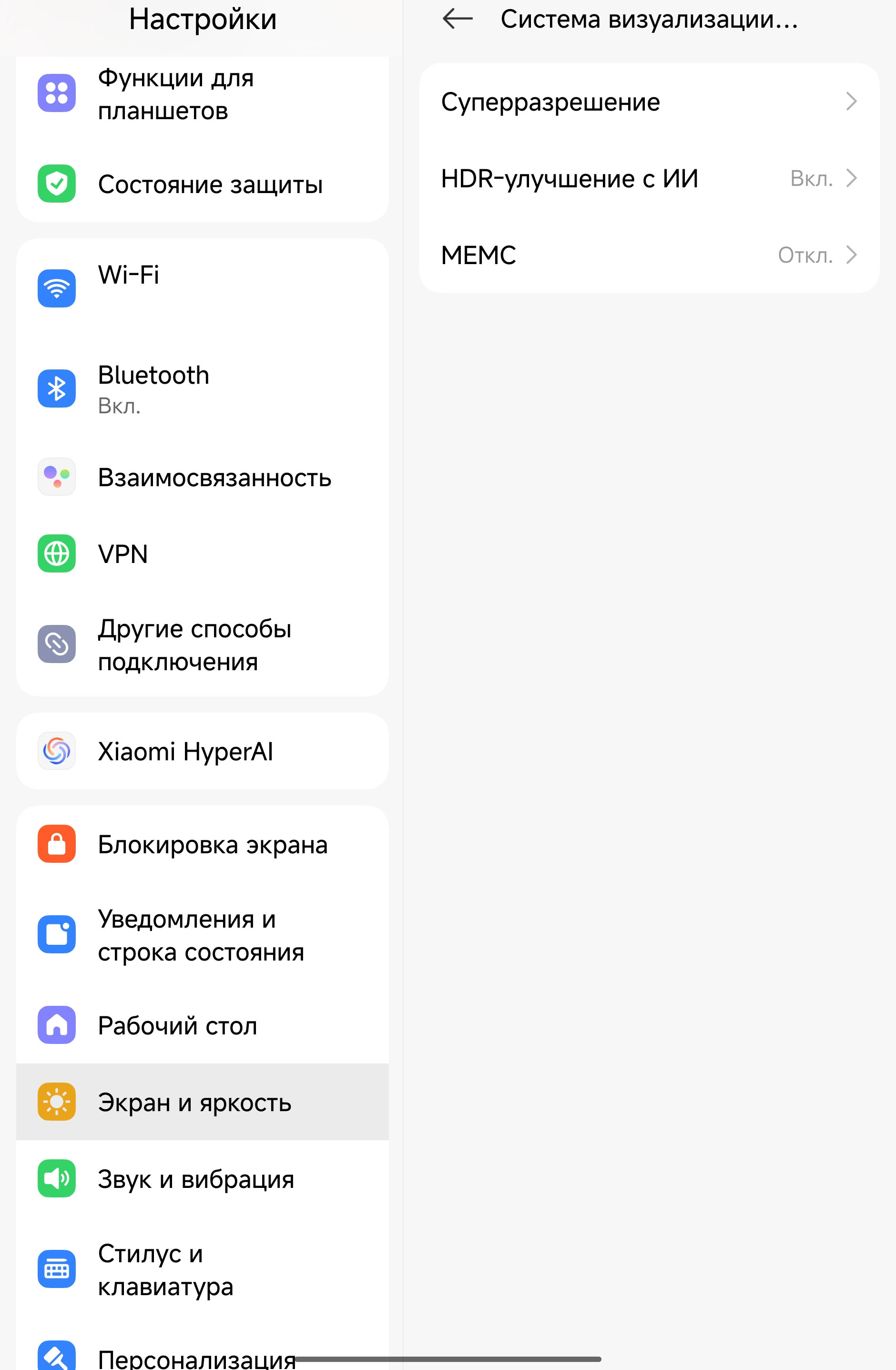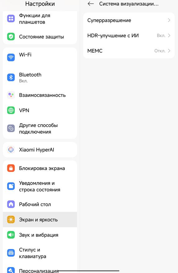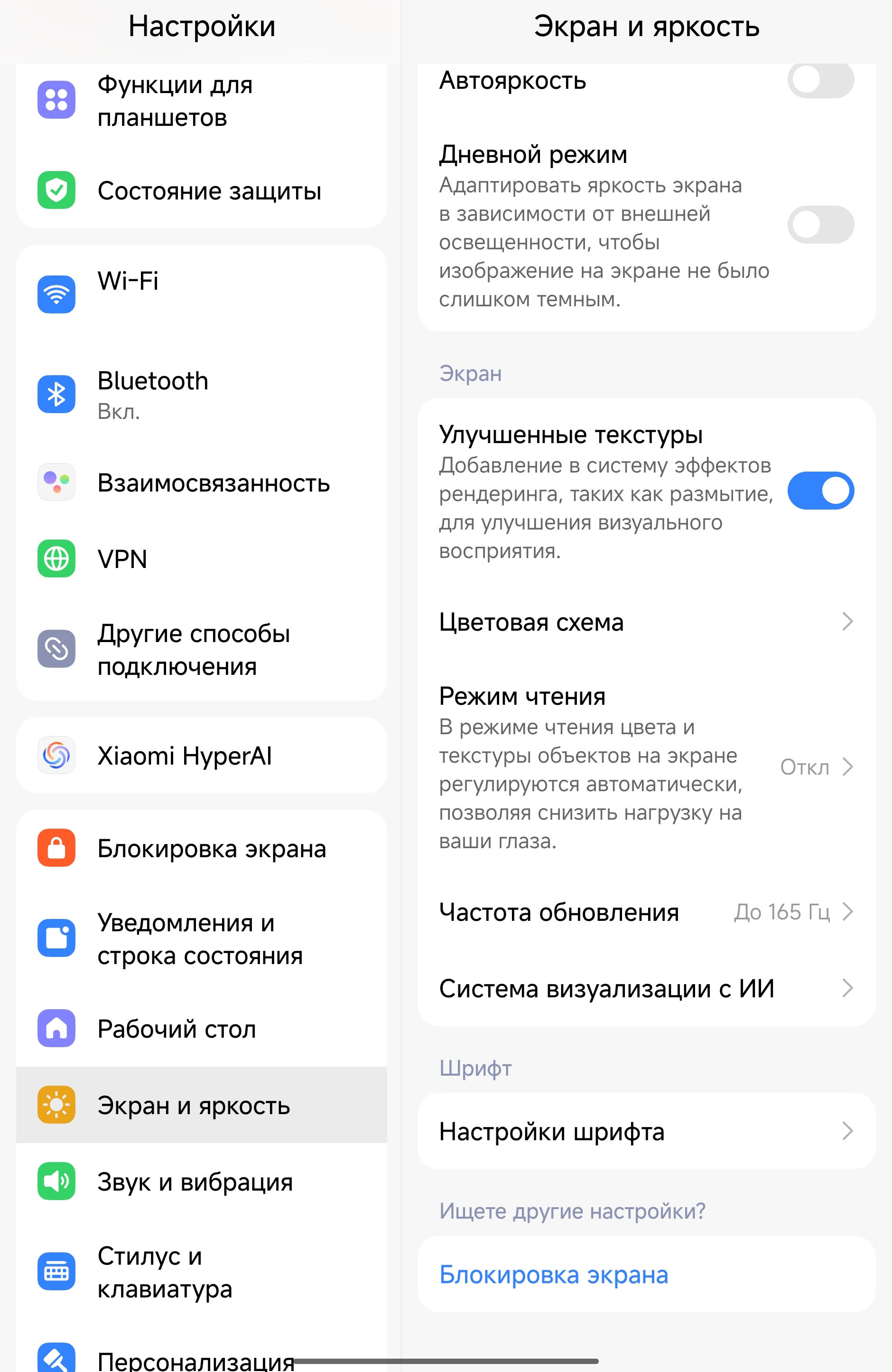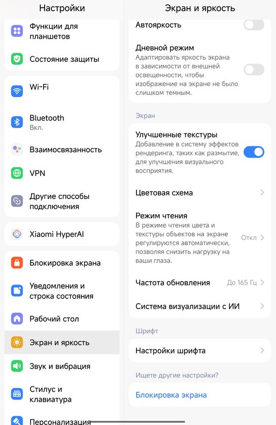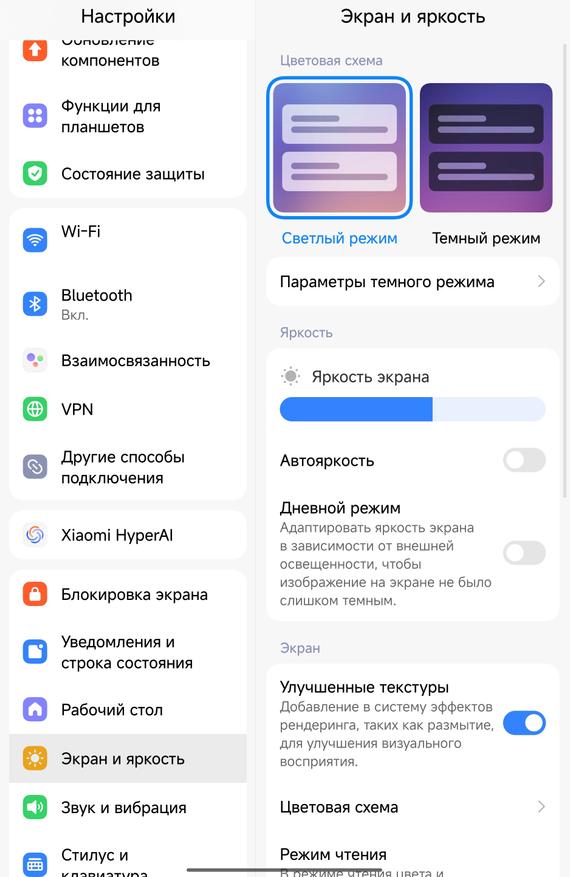 В настройках экрана есть режим улучшенных текстур — система добавляет эффекты рендеринга вроде размытия для улучшения визуального восприятия. Включил, и интерфейс стал ещё плавнее и приятнее глазу. Есть калибровка цветов, режим чтения и дневной режим для комфорта глаз.