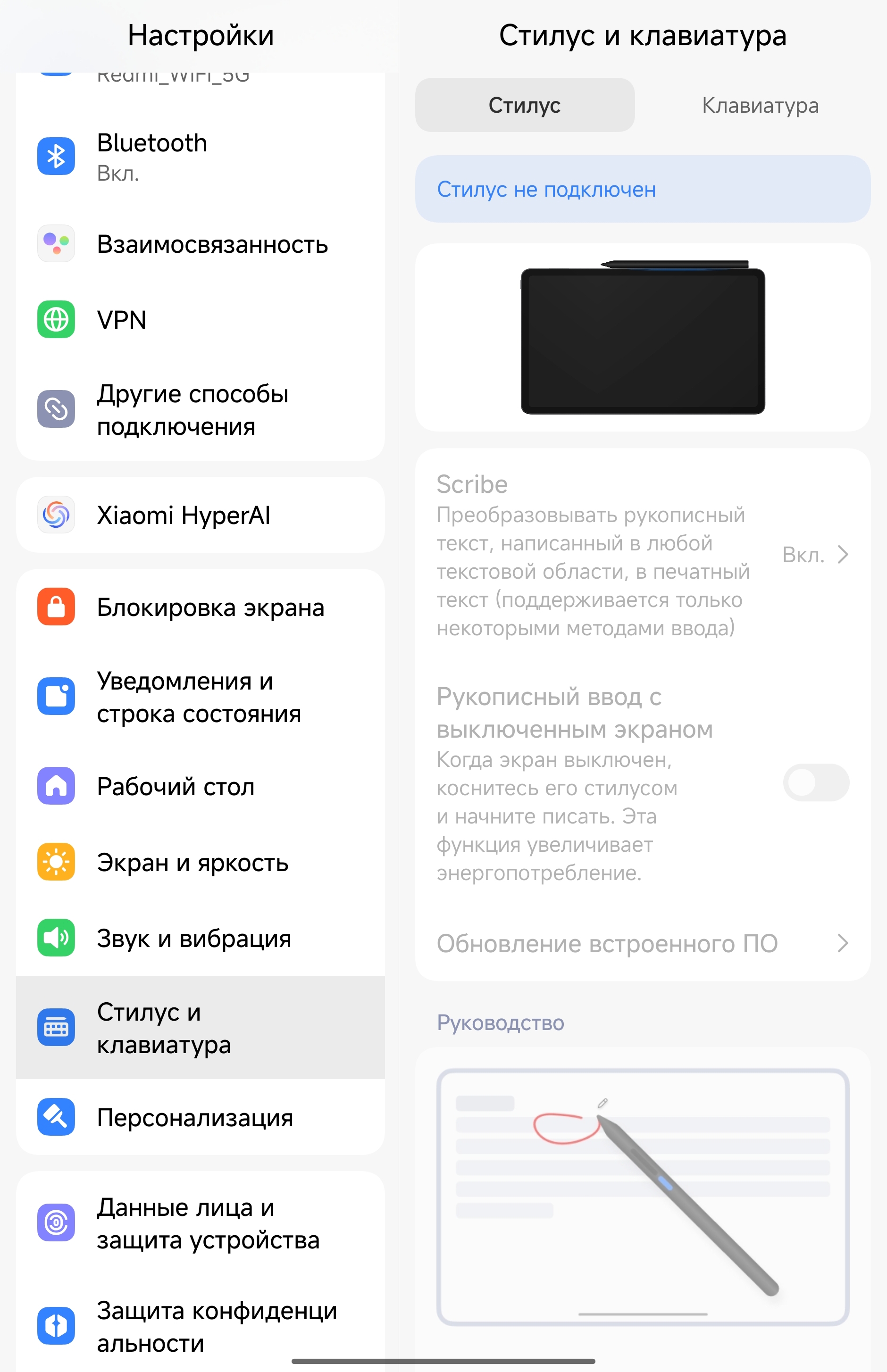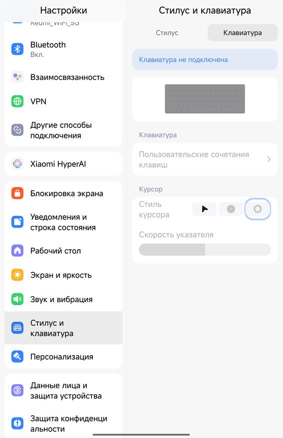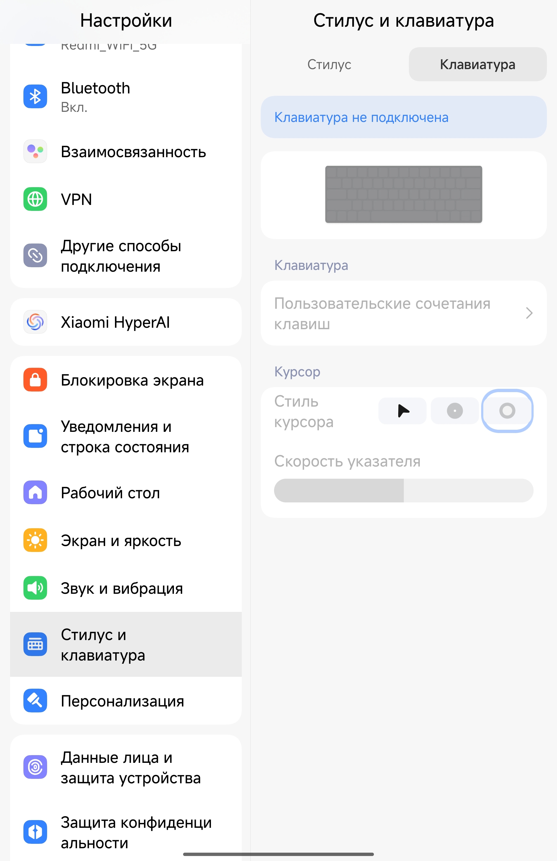 Ещё один классный момент — поддержка стилуса (хотя в комплекте его нет, придётся покупать отдельно). Можно использовать функцию Scribe для распознавания рукописного текста, есть режим рукописного ввода с выключенным экраном для энергоэффективности. Для тех, кто любит рисовать или делать заметки от руки, это отличное дополнение, как и в старших версиях. Магнитное крепление на правой грани держит стилус надёжно. Также есть поддержка клавиатуры через Bluetooth — можно подключить внешнюю клавиатуру и превратить планшет в подобие ноутбука. В настройках можно настроить курсор, скорость указателя и другие параметры. Удобно для работы с документами.