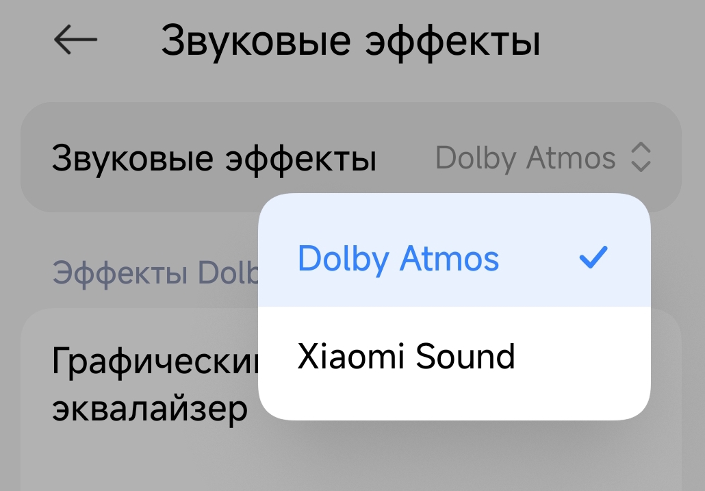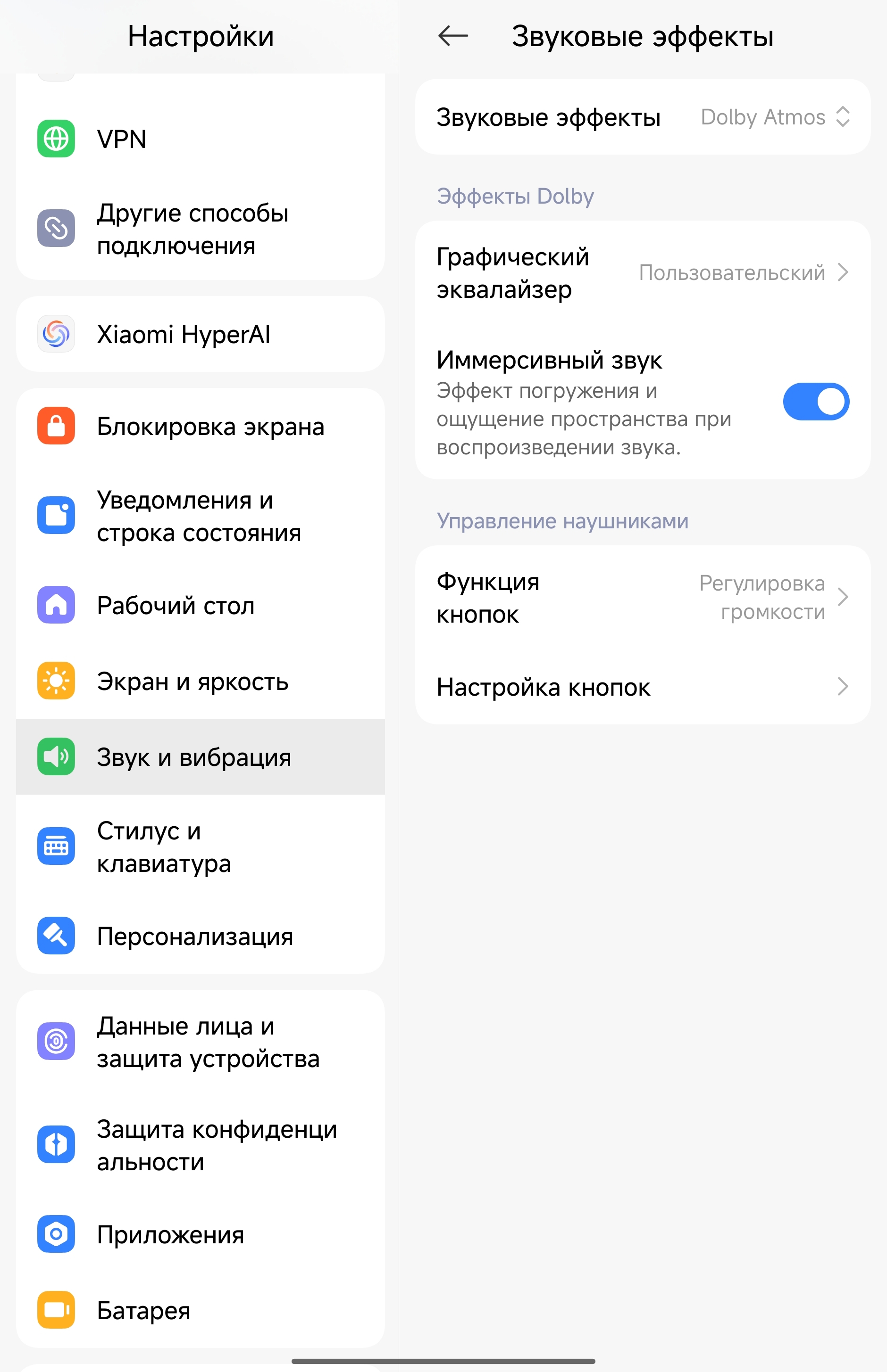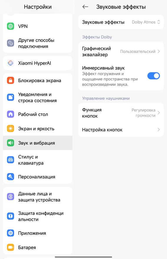 Но самое интересное — это настройки звука в HyperOS. Я не встречал такого количества опций в стоковых прошивках других производителей. В разделе «Звуковые эффекты» можно выбрать между Dolby Atmos и фирменной настройкой Xiaomi Sound — каждая даёт свой характер звучания. Dolby Atmos добавляет пространственности и объёма, отлично подходит для фильмов и игр. Xiaomi Sound звучит чуть натуральнее, хорош для музыки.