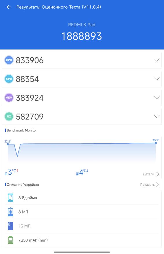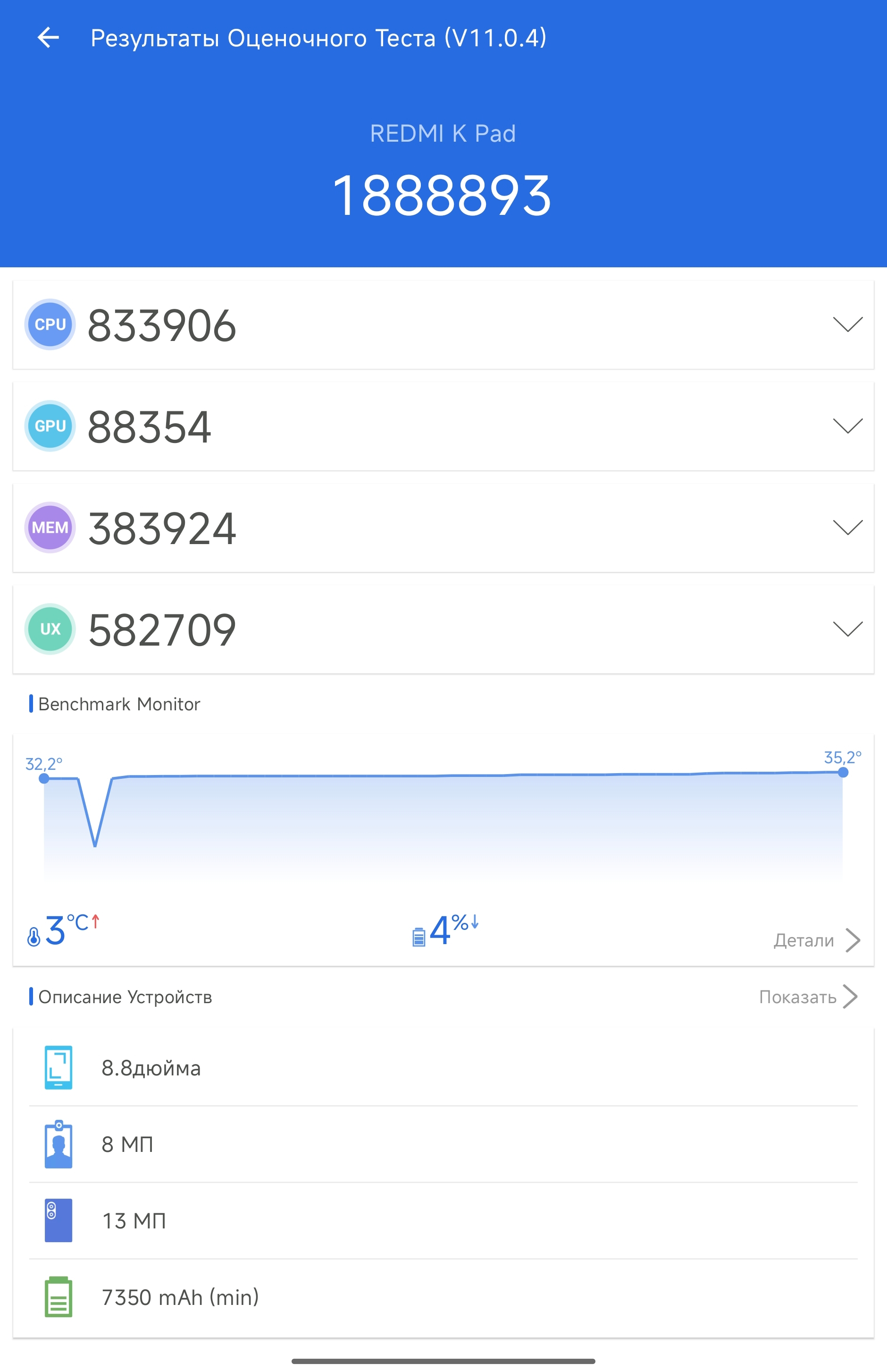 В AnTuTu планшет выдал почти 1,89 миллиона баллов — это флагманский результат. Да, на чистом устройстве могло быть и выше, но даже так цифра впечатляет. Для сравнения: процессор показал 833906 баллов, графика — 88354, память — 383924, пользовательский опыт (UX) — 582709.