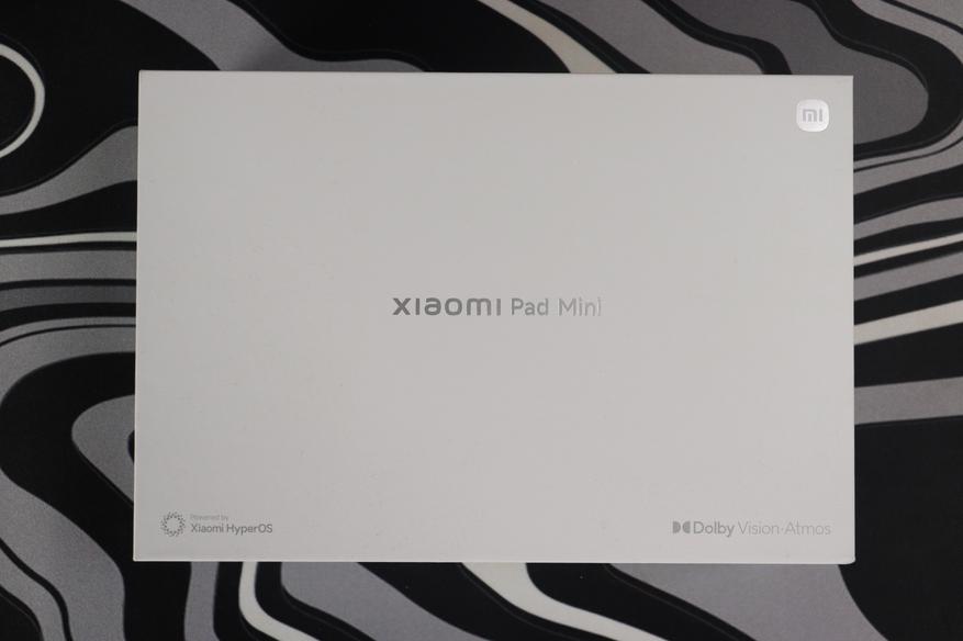 Коробка выполнена в фирменном стиле Xiaomi — белый картон, минималистичный дизайн. На лицевой стороне крупно написано «Xiaomi Pad Mini», в углу — логотип mi, а внизу красуются шильдики «Powered by Xiaomi HyperOS» и «Dolby Vision-Atmos».