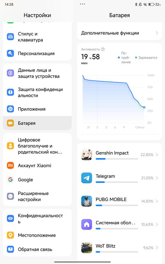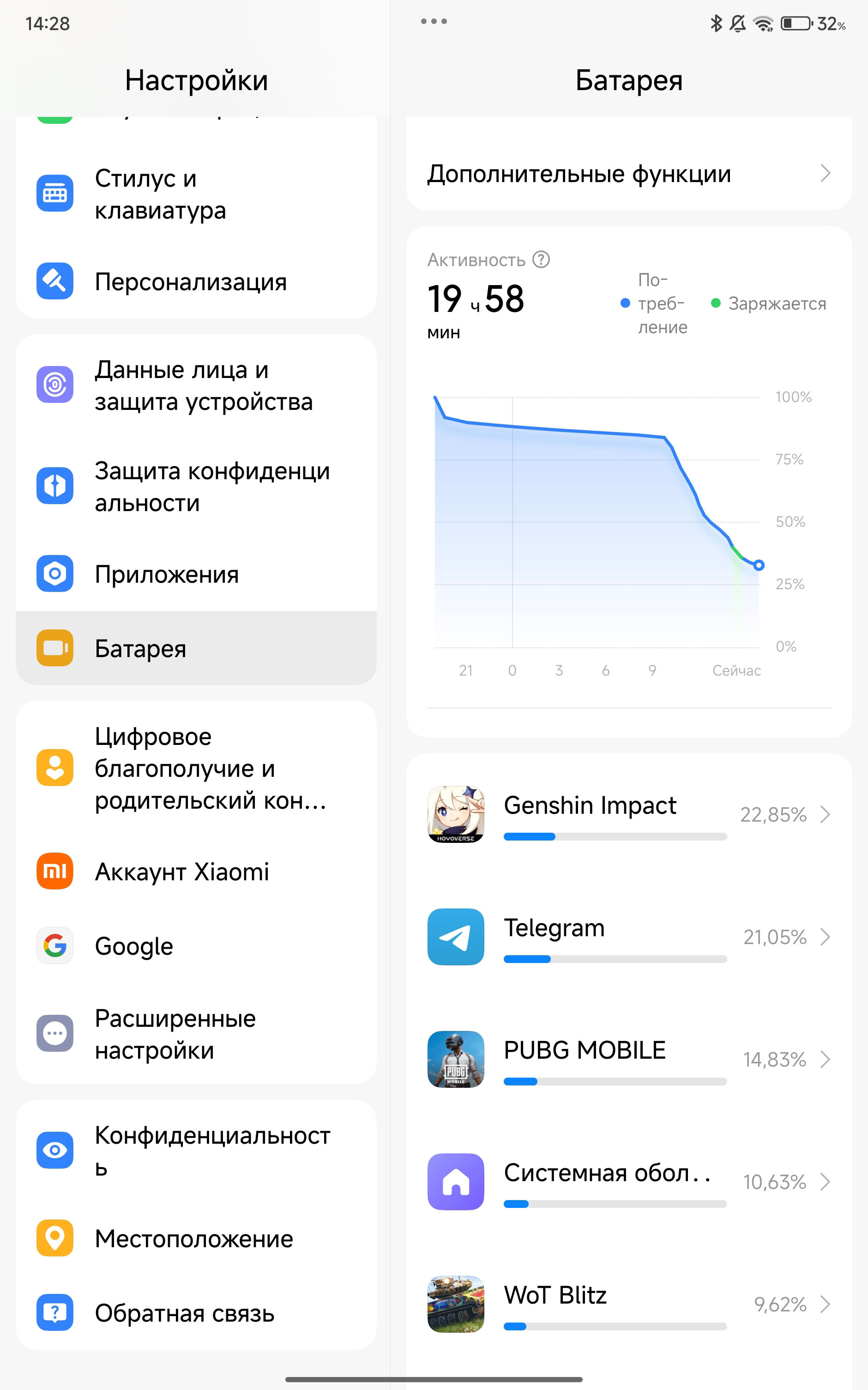 За время тестирования я замерял реальное время работы в разных сценариях. На скриншоте видна типичная картина моего использования: с момента последней зарядки прошло почти 20 часов, и заряд упал до 32%. При этом на графике видно, что основная разрядка пришлась на период активного использования. До этого планшет просто лежал в режиме ожидания.
