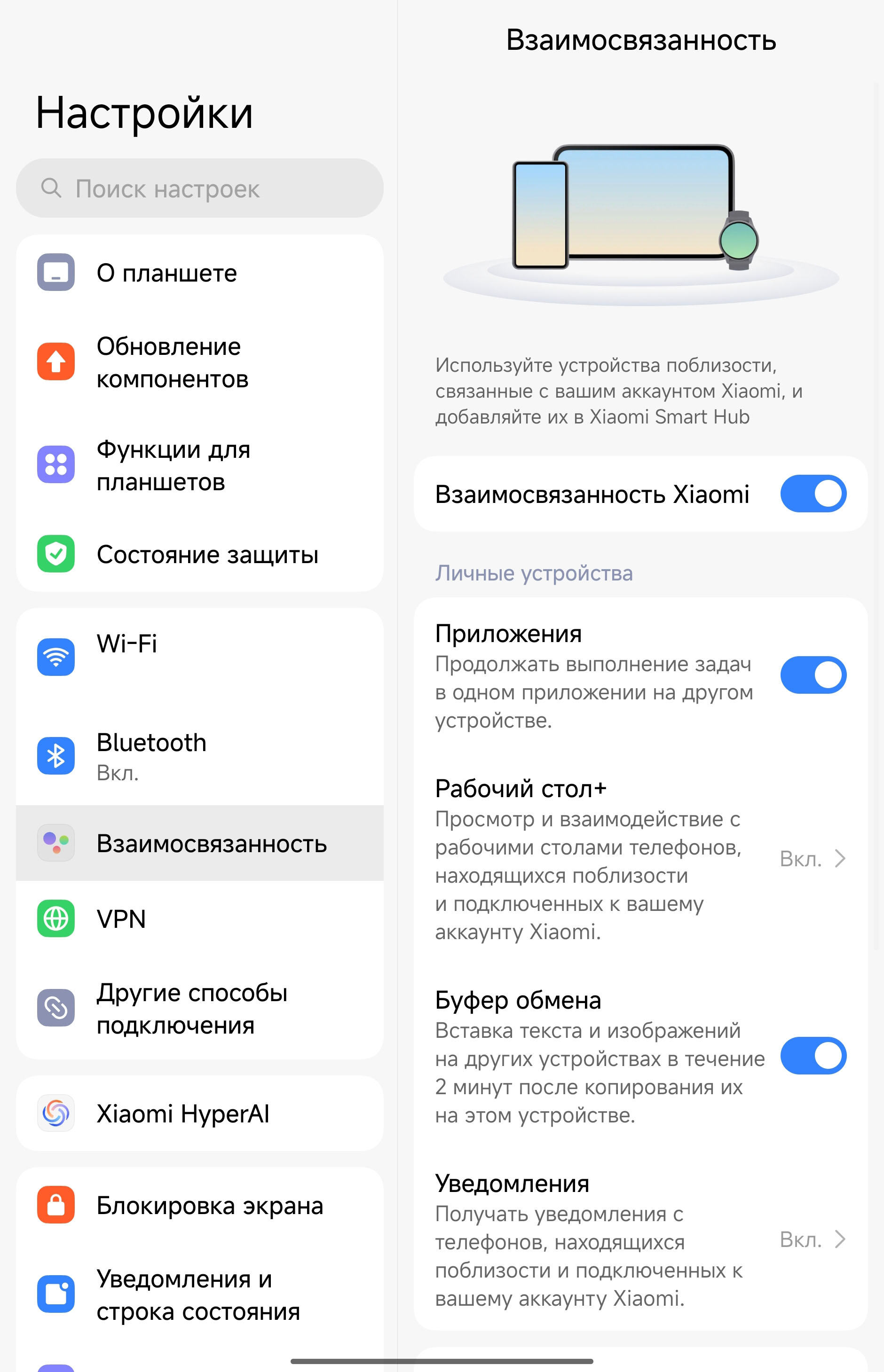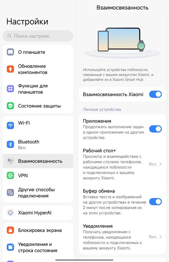 Экосистема Xiaomi тут работает на ура. Функция «Взаимосвязанность» позволяет бесшовно передавать задачи между устройствами Xiaomi. Например, начали смотреть видео на планшете — продолжили на телефоне. Или наоборот. Буфер обмена синхронизируется автоматически — скопировали текст на планшете, вставили на смартфоне. Очень удобно, если у вас несколько устройств бренда.