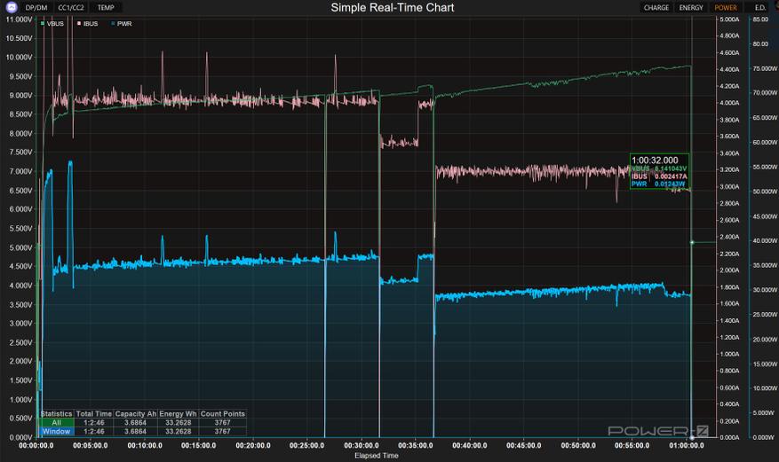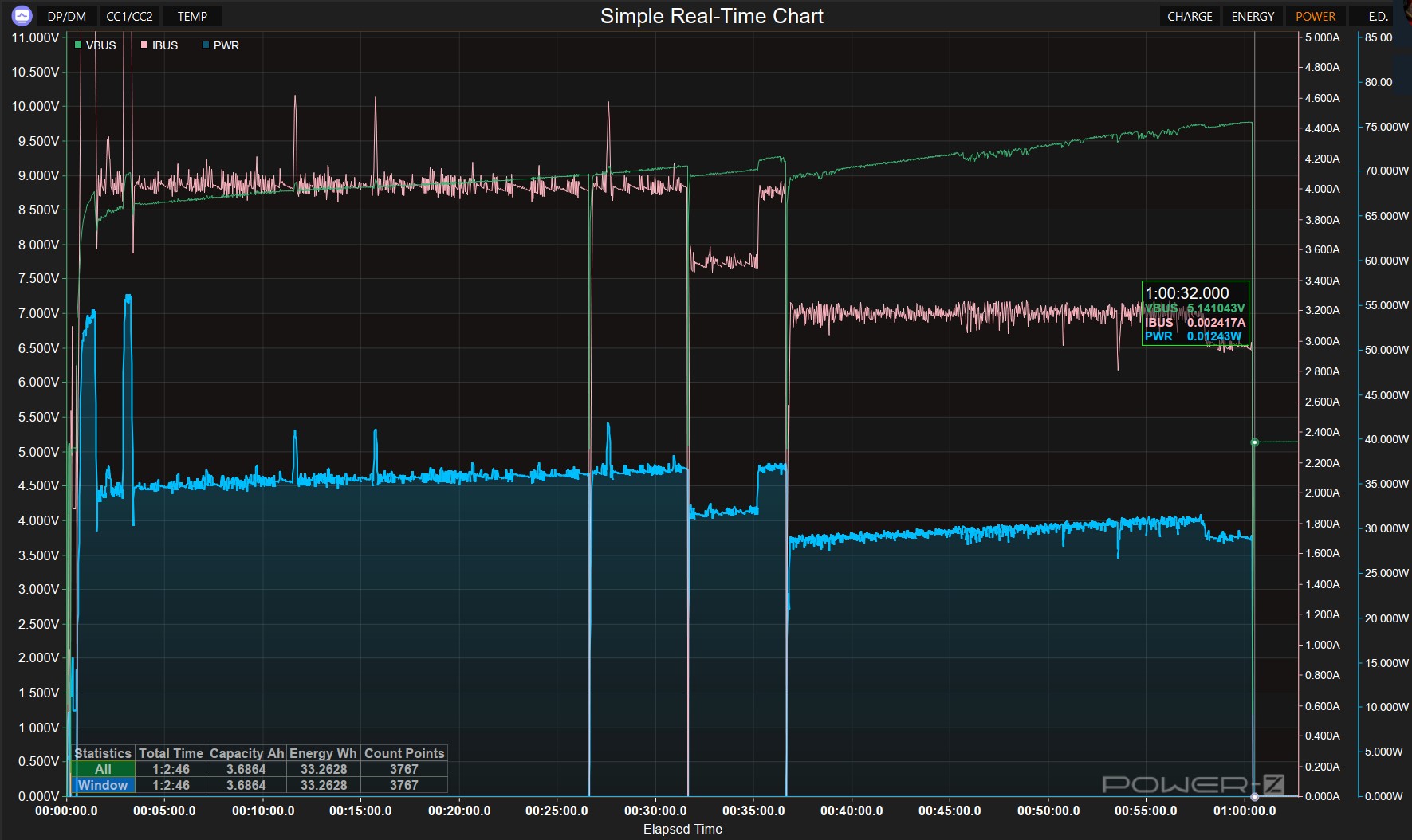 Процесс зарядки идёт по классической схеме: сначала быстрая фаза с максимальной мощностью (около 35-40 Вт), потом постепенное снижение по мере приближения к 80%, и после 80% мощность падает до 15-20 Вт для безопасности батареи. Такая схема продлевает срок службы аккумулятора, но лишает возможности зарядиться ультрабыстро.