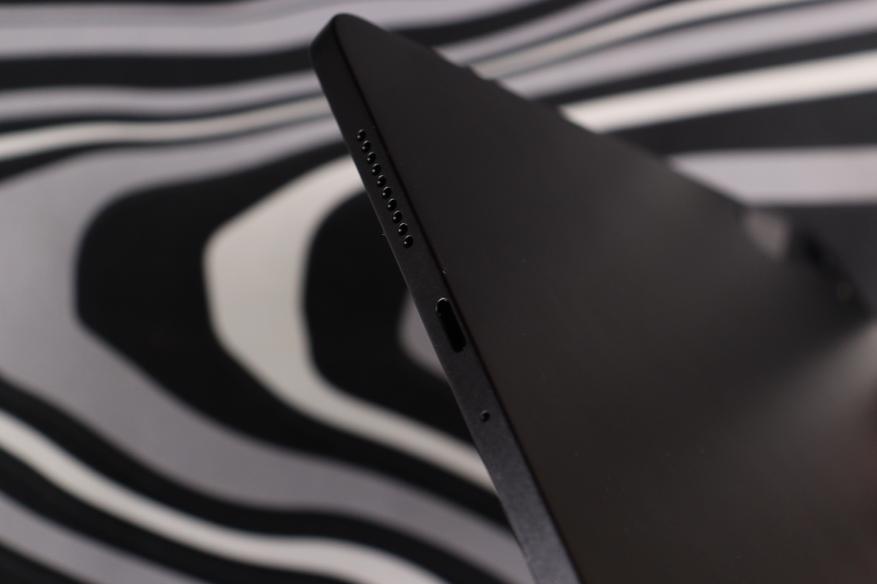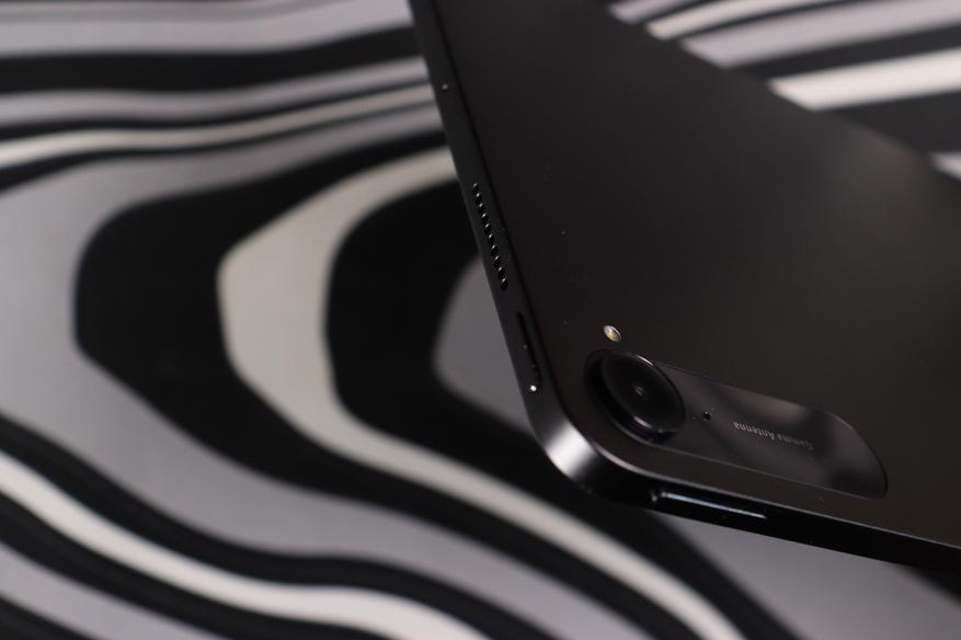 В верхнем углу — скромный модуль камеры, который почти не выступает над корпусом. Теперь о портах и кнопках. Справа расположены качелька громкости, а также магнитное место под стилус — очень удобно для тех, кто планирует докупить перо отдельно. Слева находится ещё один USB-C порт с поддержкой быстрой передачи данных и выдачу видеосигнала на телевизор или монитор — это приятный бонус. Сверху расположились динамики (полноценное стерео) и кнопка включения, а снизу находится основной USB-C (только зарядка) и вторые динамики.