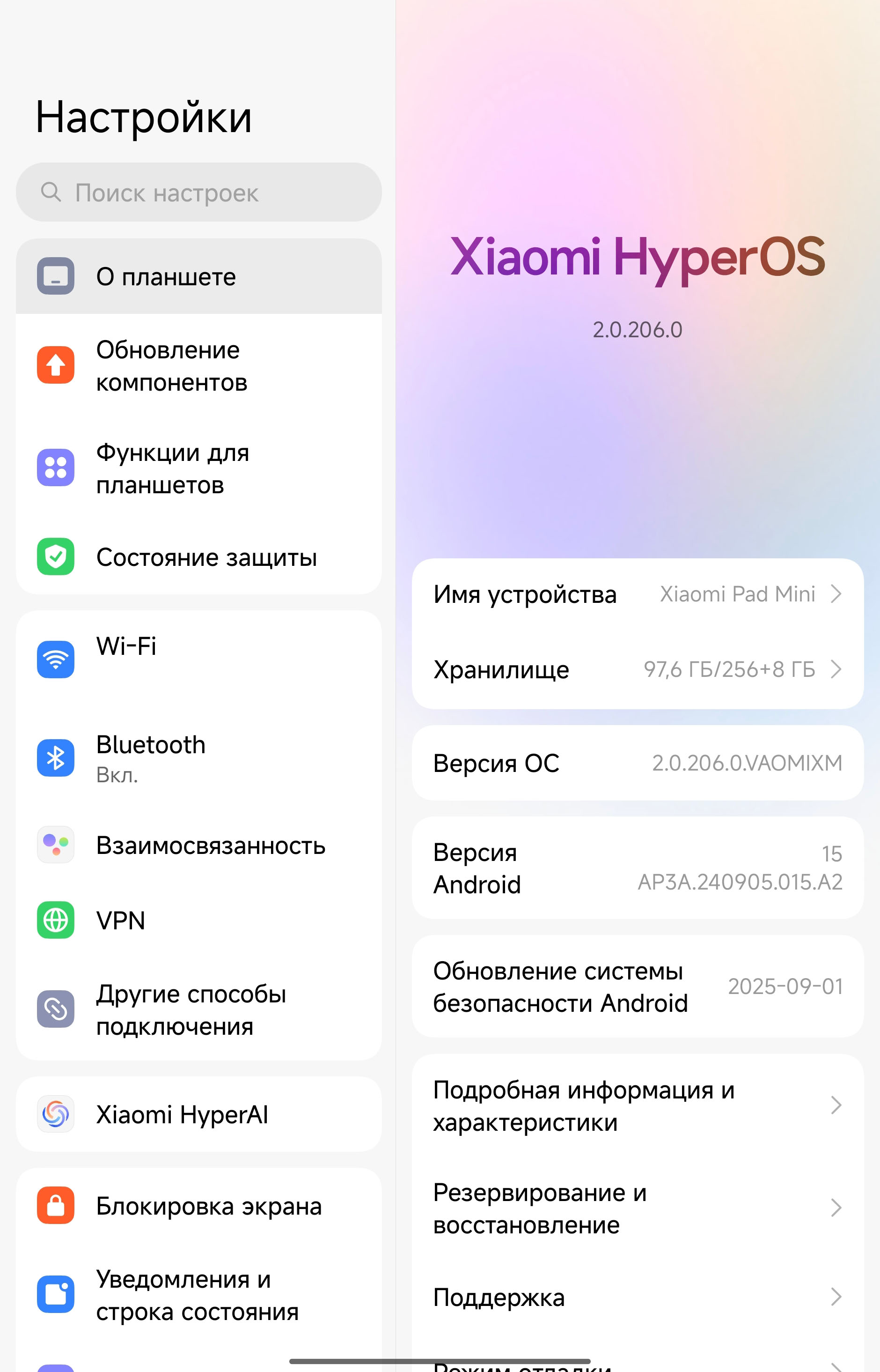 Планшет работает на самой свежей HyperOS 2.0.206.0 (Android 15), и это одна из лучших реализаций оболочки для планшетов, которую я видел. Интерфейс приятный, интуитивно понятный, всё на своих местах. На флагманском железе система работает фантастически быстро — никаких подлагиваний или тормозов я не обнаружил. Есть небольшой нюанс: иногда при переходе из горизонтального положения в вертикальное могут быть микрофризы, но это скорее не фризы, а слишком замедленная анимация поворота экрана. Лечится просто: заходите в меню разработчика и ставите все анимации на 0.5x вместо стандартных 1x. После этого система становится в два раза отзывчивее, и любые задержки исчезают.