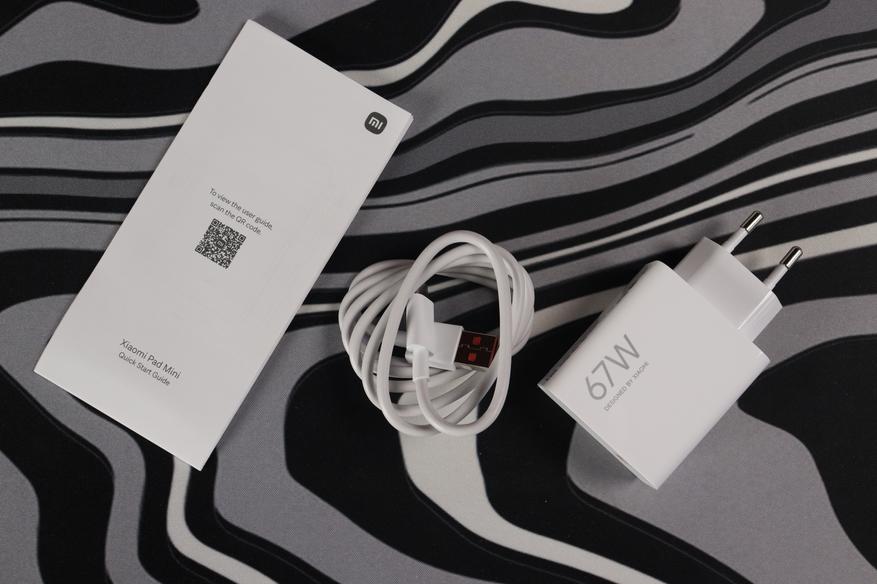 Комплектация простая, но достаточная: сам планшет, зарядный блок на 67W, белый USB-кабель и краткое руководство с QR-кодом для полной инструкции. Никаких чехлов или стекол в комплекте нет, но наличие зарядки уже компенсирует этот момент.