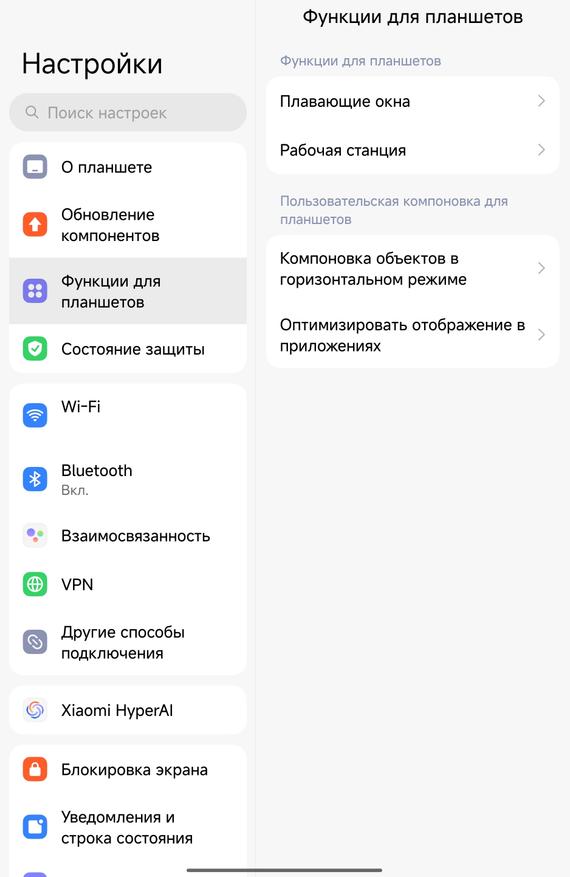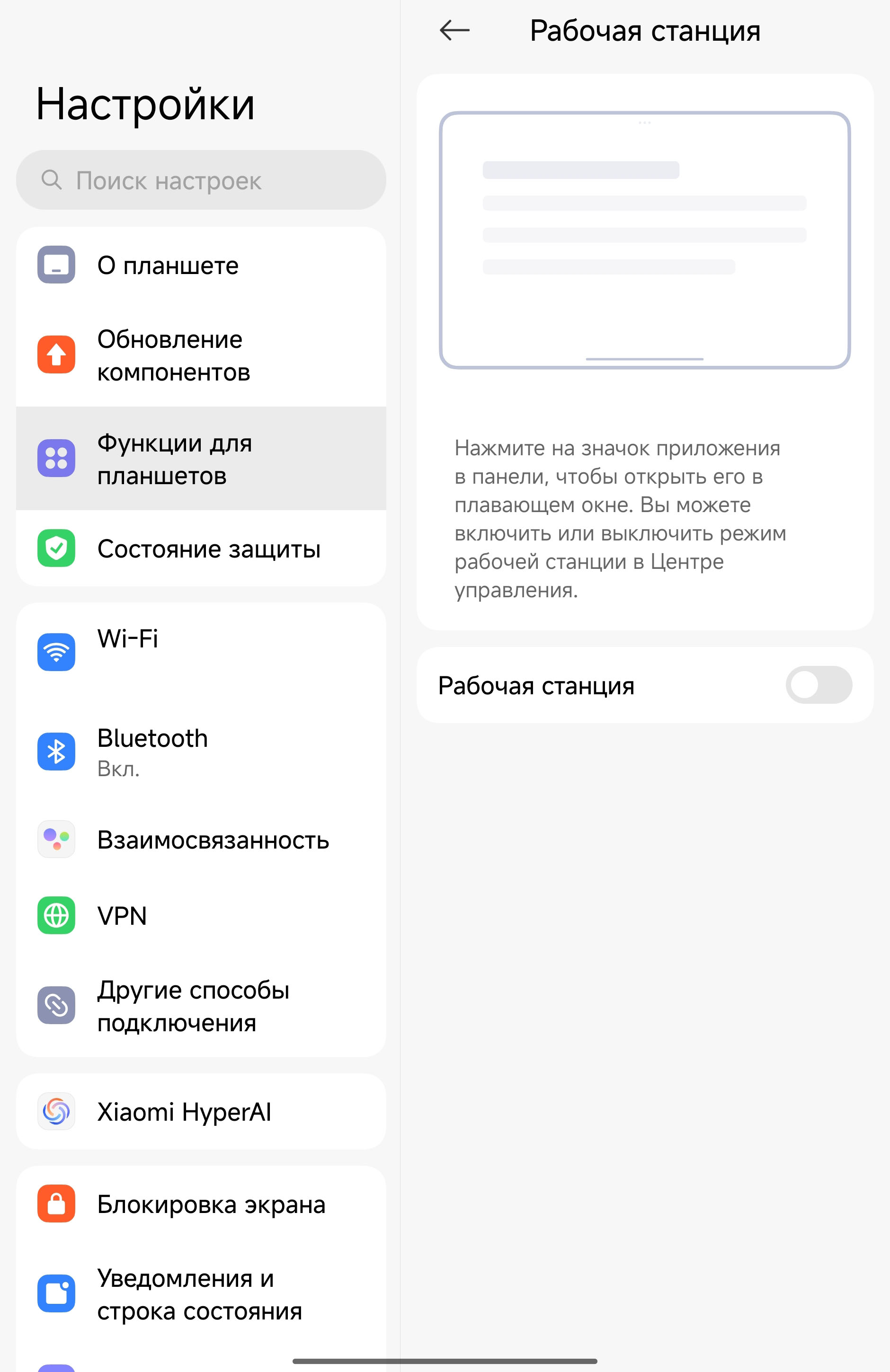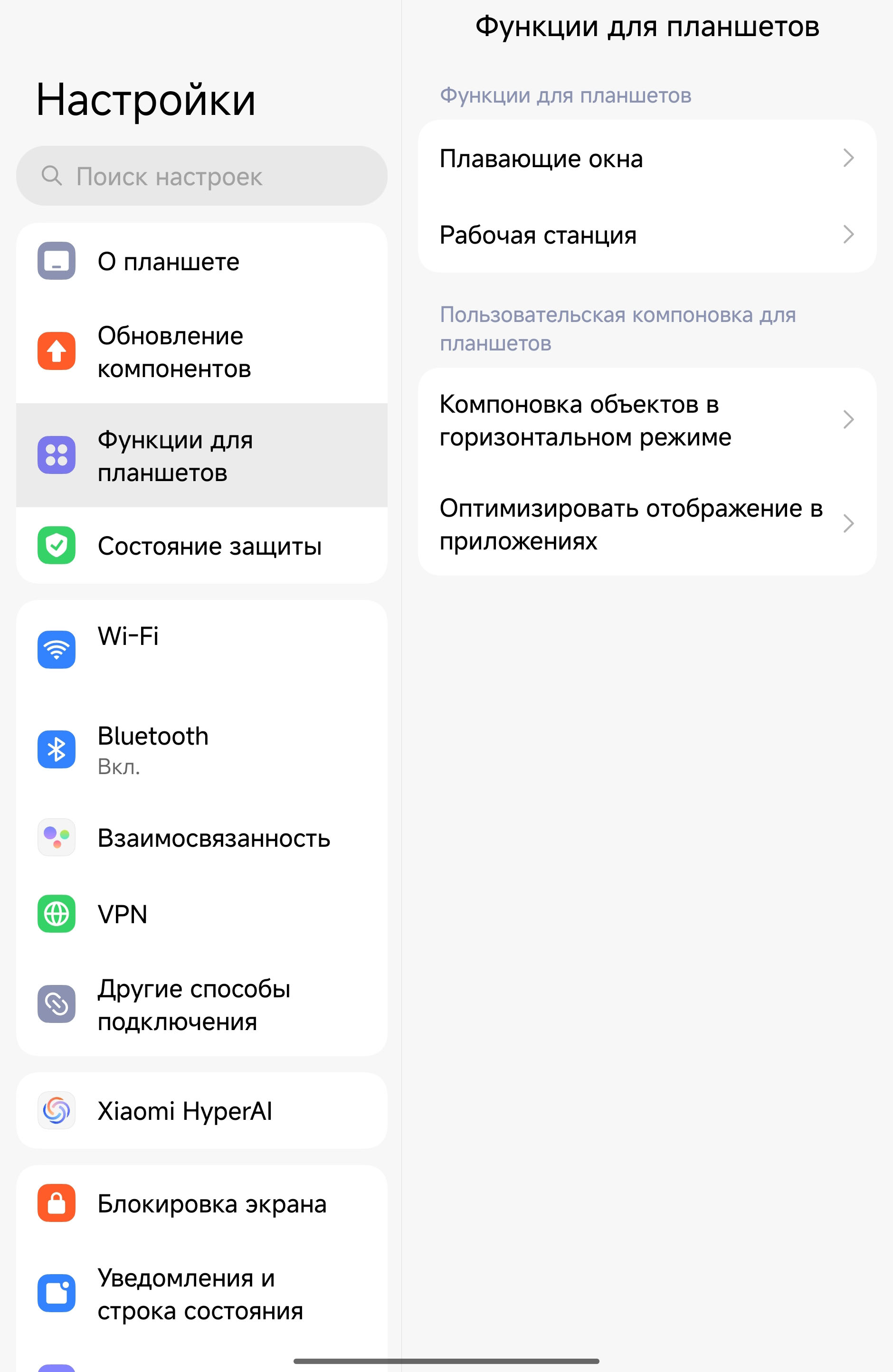 HyperOS 2.0 предлагает массу полезных функций специально для планшетов. Есть режим рабочей станции, который позволяет открывать приложения в плавающих окнах — удобно для многозадачности. Можно запустить несколько приложений одновременно в режиме разделённого экрана, причём не только два, но и три-четыре окна при желании.