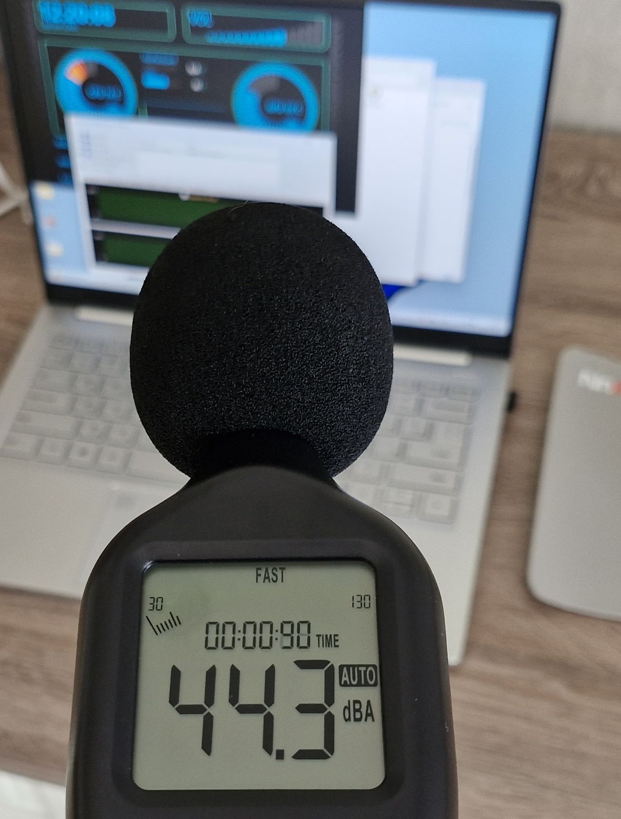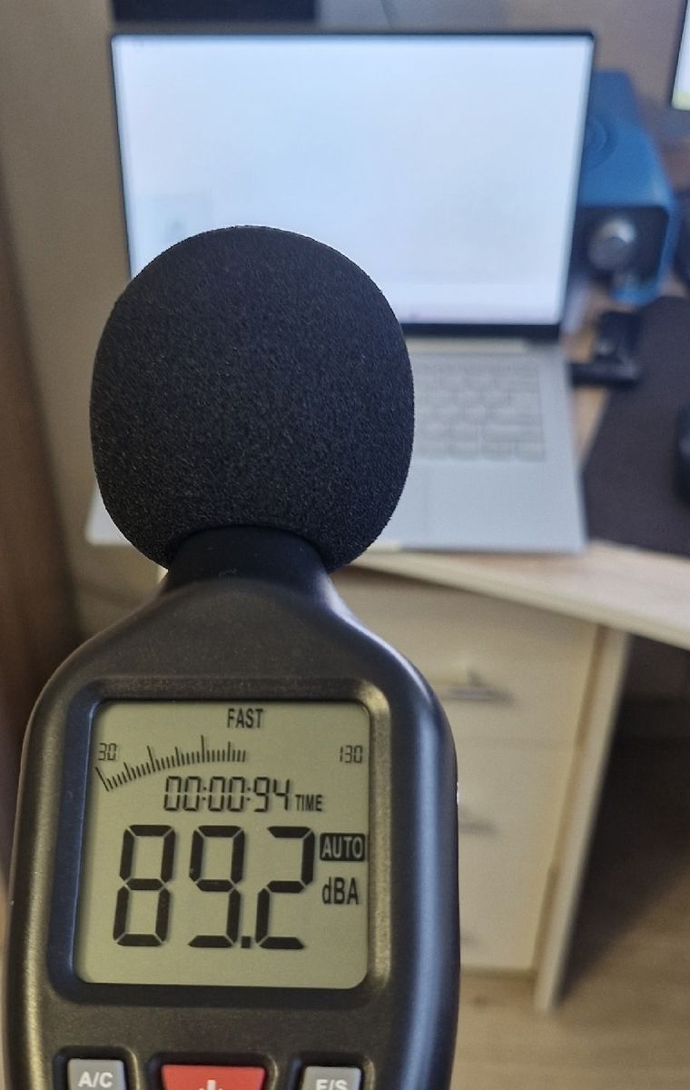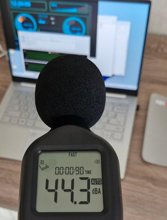 Максимальное звуковое давление от системы охлаждения при нагрузке на ЦП 100% (температура SoC при этом около 70-80 С, а корпус не нагревается выше 46 градусов в районе выхлопа горячего воздуха):