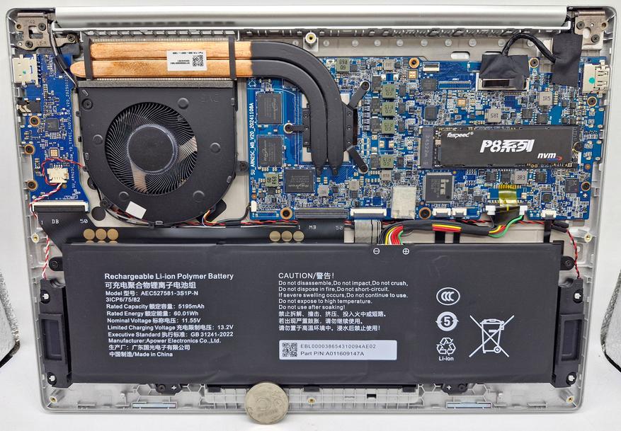 Нижняя крышка держится на винтах (9 шт.), один под гарантийной наклейкой. В целом пользователю доступ внутрь и не нужен (память не увеличить, накопитель M2 достаточной емкости, сетевая карта распаяна). Хорошо видна система охлаждения с многолопастной тубинкой и аккумуляторная сборка на треть площади корпуса. Петли металлические.