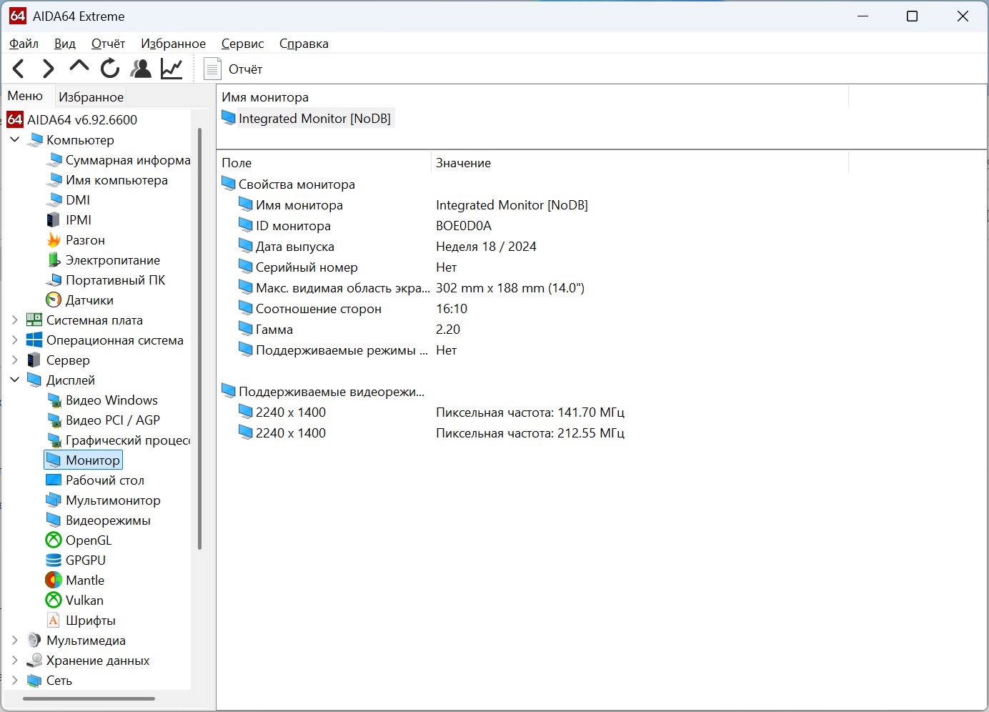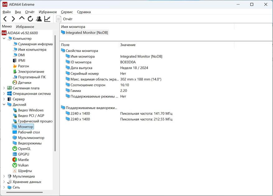 Разрешение в операционной системе 2240х1400 на 60 Гц.