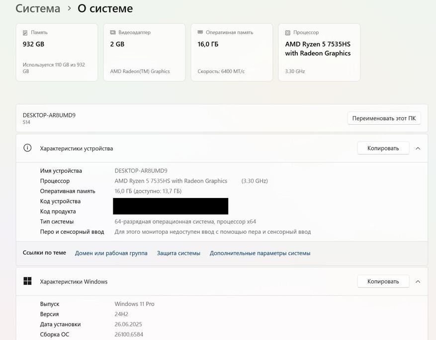 Процессор 7535HS от AMD выпуска 2023 г. по технологии 6 нм. Частота от 3,3 ГГц до 4,55 ГГц. Работает в паре с базовой встроенной графикой Radeon 660M. Распаянная ОЗУ LPDDR5 6400 МГц (чипы от RaySon) работает в двухканальном режиме.