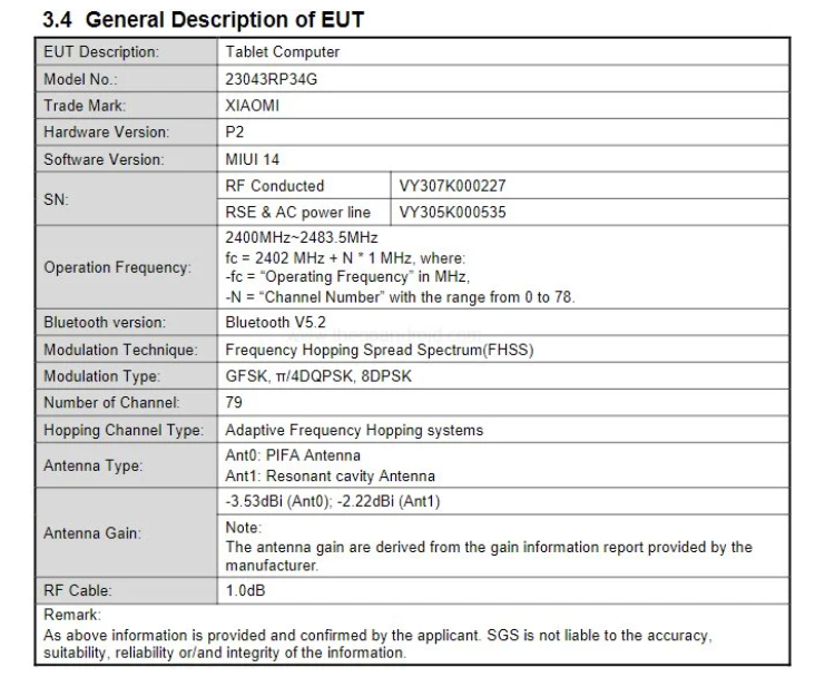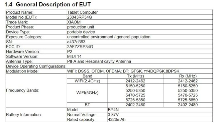 Посмотрим на информацию из отчетов FCC. Здесь мы можем увидеть информацию, что планшет будет питаться от аккумулятора с номинальной емкостью 4320 mAh, т.е фактически это батарея на 4500 mAh. Также мы видим, что поддерживается быстрая зарядка с мощностью 33W, что позитивно скажется на скорости зарядки. В базе также можно найти информацию по версиям памяти, будет доступно 2 варианта: 6GB\128GB и 8GB\256GB. Кроме этого мы видим поддержку двухдиапазонного WiFi (2,4GHz и 5GHz), скорее всего будет поддержка WiFi6. Планшет будет работать на MIUI 14, который в свою очередь базируется на Android 13.