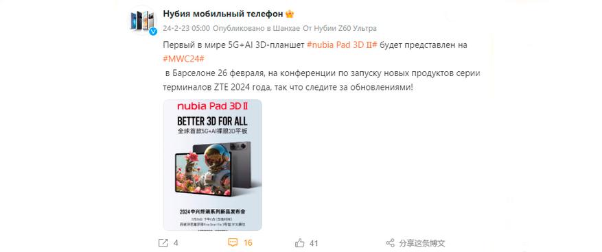 Планшет Nubia Pad 3D II дебютирует на выставке MWC 2024