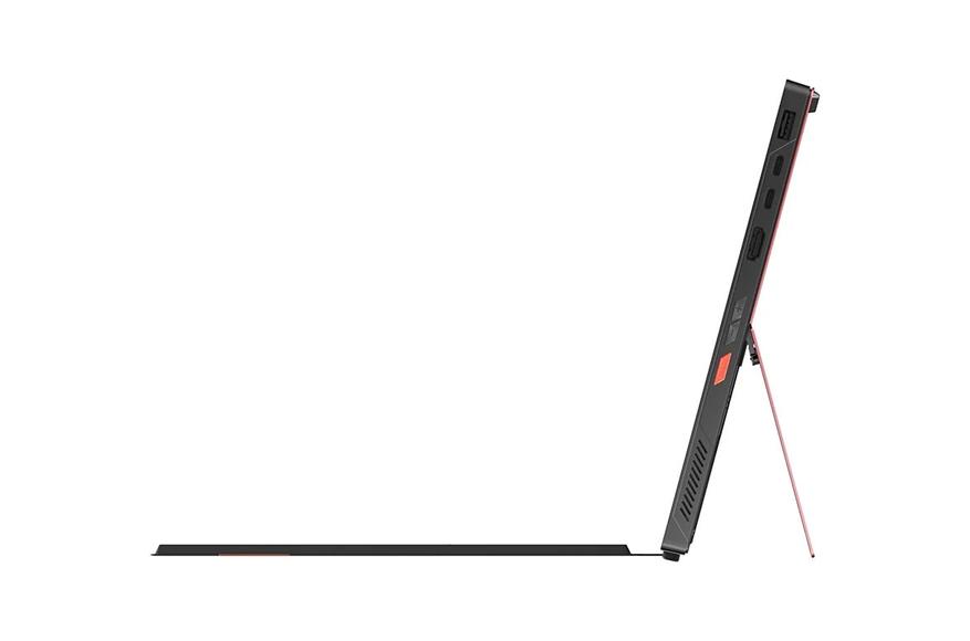 Корпус изготавливается из алюминия методом фрезеровки на станках с ЧПУ и имеет толщину в 12.5 мм. Это на ~ 2.5 мм тоньше, чем планшет от Asus. На задней панели размещена широкая регулируемая подставка с углом наклона до 173°, а в качестве аксессуара предлагается съемная клавиатура с тачпадом на магнитном креплении. Встроенная система охлаждения включает тепловые трубки и кулер, что позволяет процессору работать на полную мощность во время длительных игровых сессий.