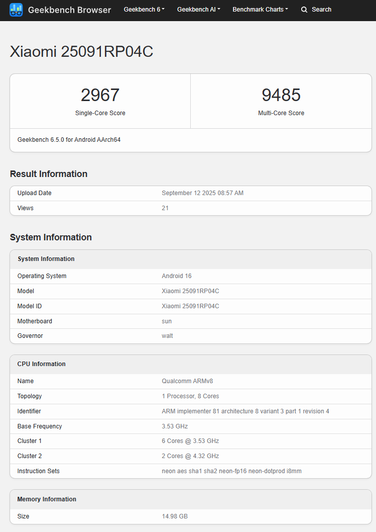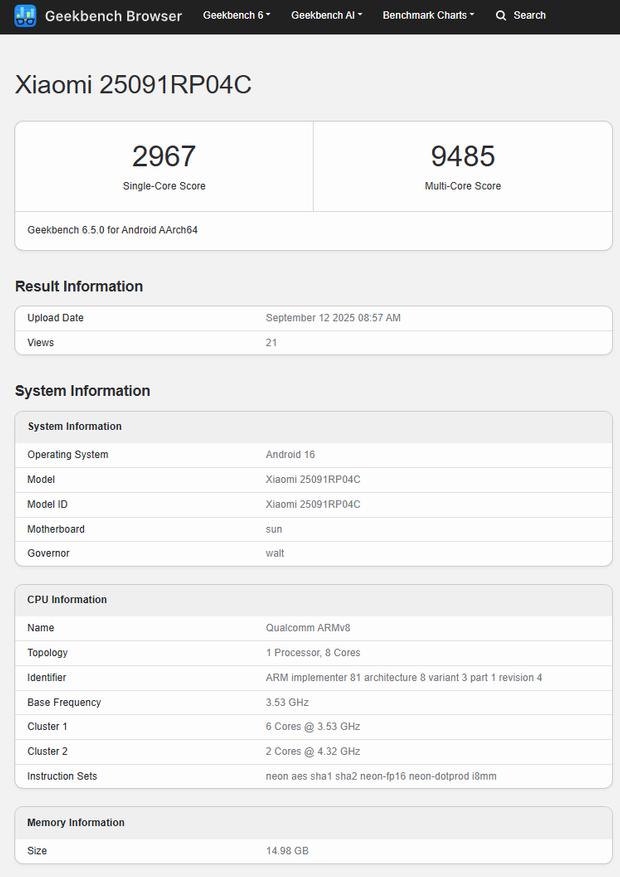 Тем временем в базе Geekbench появился планшет с индексом 25091RP04C, который ранее связывали именно с Pad 8 Pro. В тестах подтверждена связка аккумулятора на 10 000 мАч с быстрой зарядкой 67 Вт и новый чипсет Qualcomm Snapdragon 8 Elite. Geekbench указывает на восьмиядерный процессор с идентификатором ARM implementer 81, что полностью совпадает с характеристиками 8 Elite.