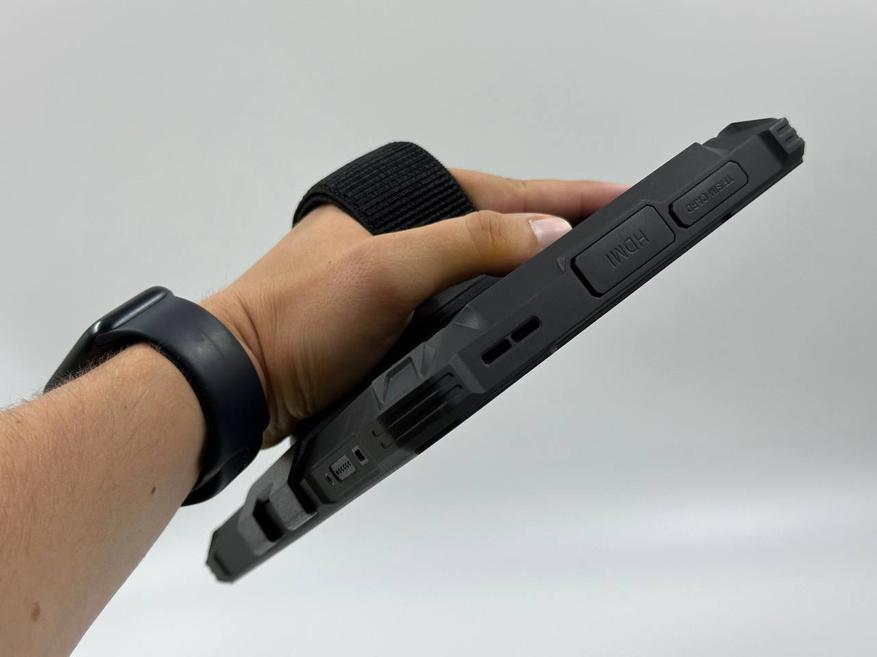 На правом торце расположена кнопка включения/выключения и качельки регулировки громкости. Под резинойо заглушкой также спрятан 3.5 мм джек и type-c порт для зарядки и передачи данных. Чуть ниже находится отверстие мультимедийного динамика. На левом торце также находится отверстие для мультимедийного динамика, ведь тут их два, а также HDMI-порт и лоток для сим-карт/карты памяти.