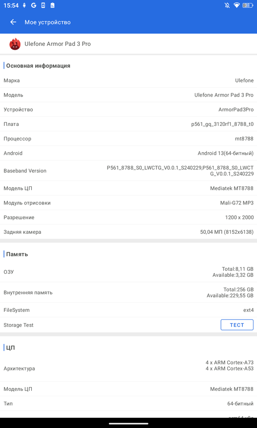 Планшет Ulefone Armor Pad 3 Pro из коробки работает под управлением ОС Andoid 13. Оперативной памяти 8Гб, встроенной 256Гб. Предустановлены приложения, которые потенциально могут быть полезны владельцам такого гаджета: компас, шумомер, уровень и другие. Ну и конечно же отдельное приложение разработано специально для управления прожекторами для кемпинга.