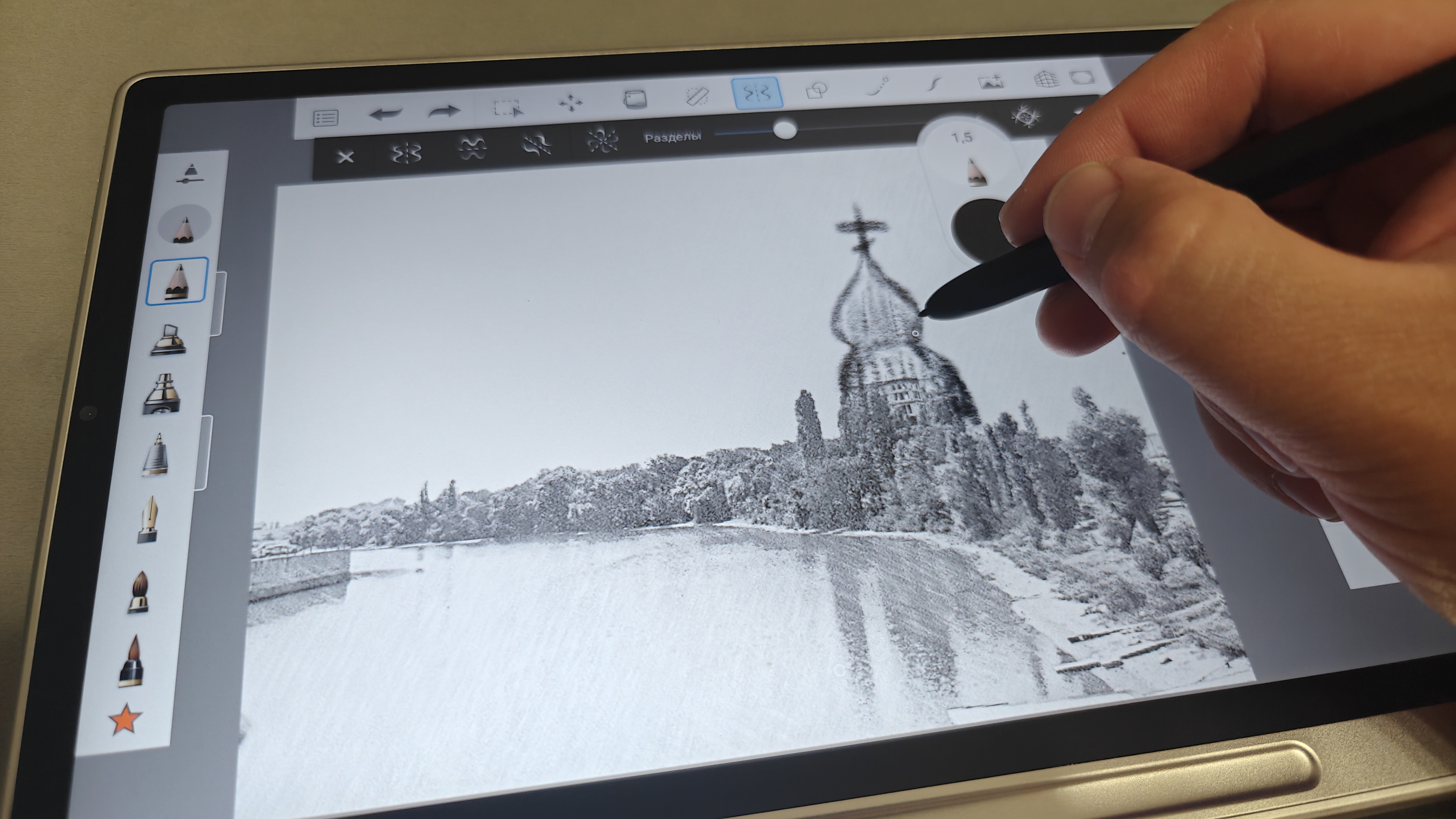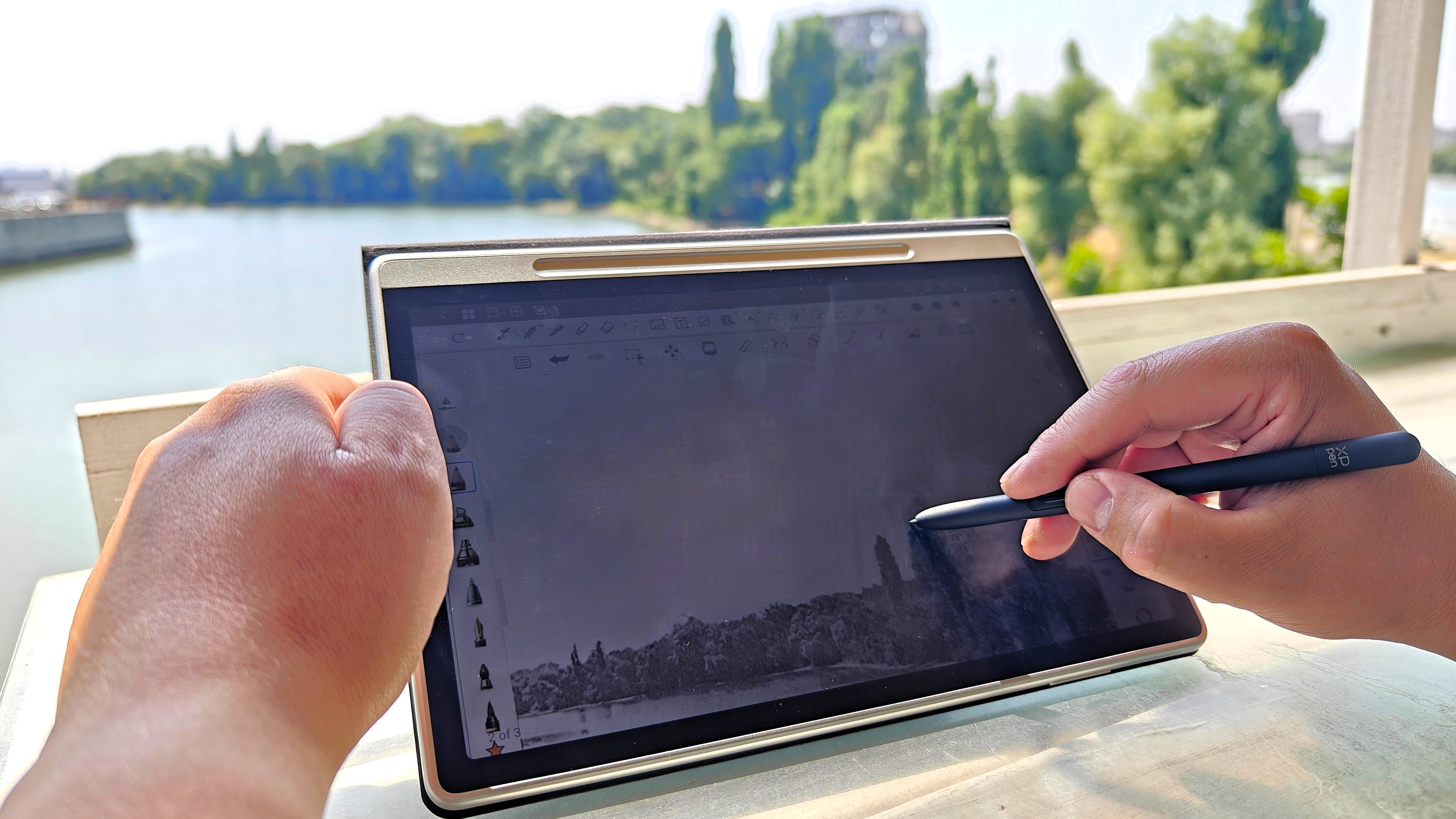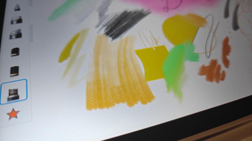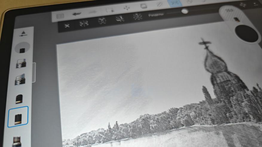 На нем можно спокойно рисовать, делать заметки, писать со стопроцентной передачей ощущения использования простого карандаша. Также очень любопытные ощущения от использования разнообразных кистей. Тут очень гибкие настройки и каждый подберет эффект под то, как он это видит. Также понравилось использовать карандаши для скетчинга. Как видно на третьем фото, тут даже имитируется оттиск карандаша на холсте. Даже в базовом ПО от XP-Pen широкий набор инструментов, включая затирки, автофигуры и ластики.