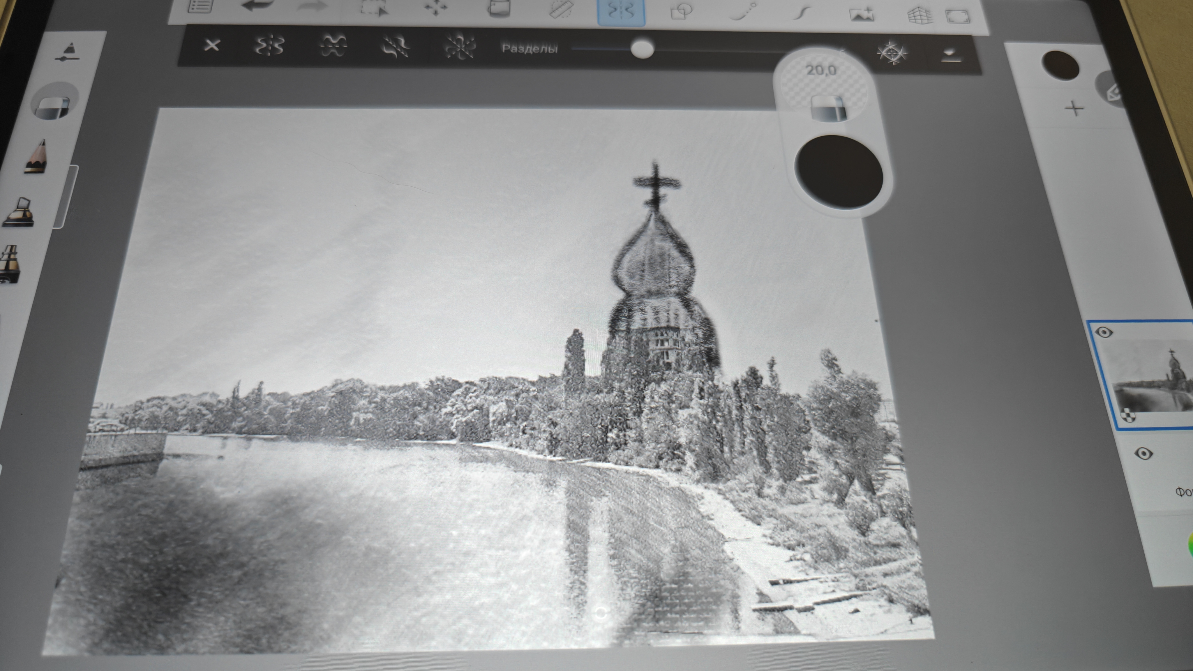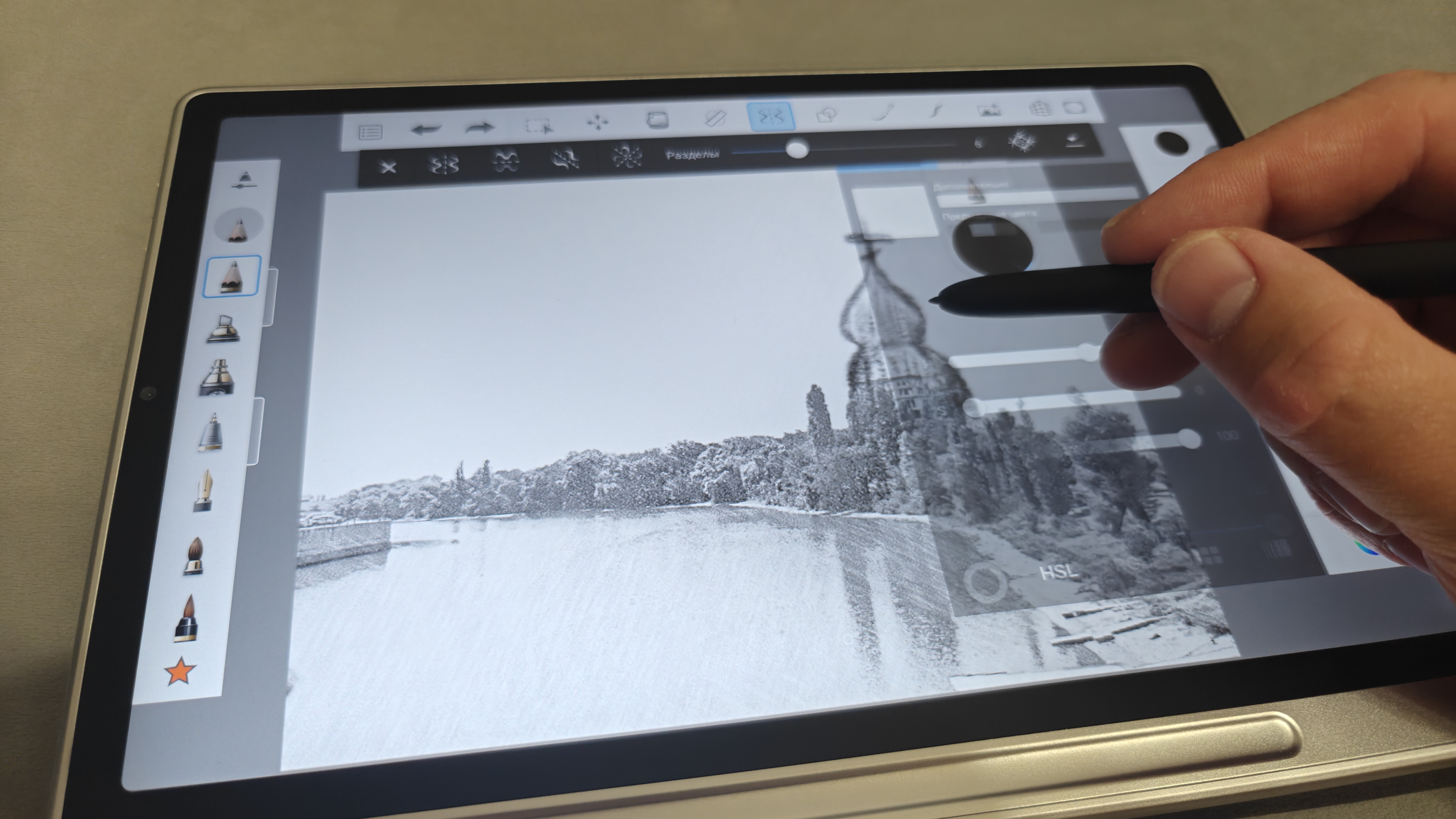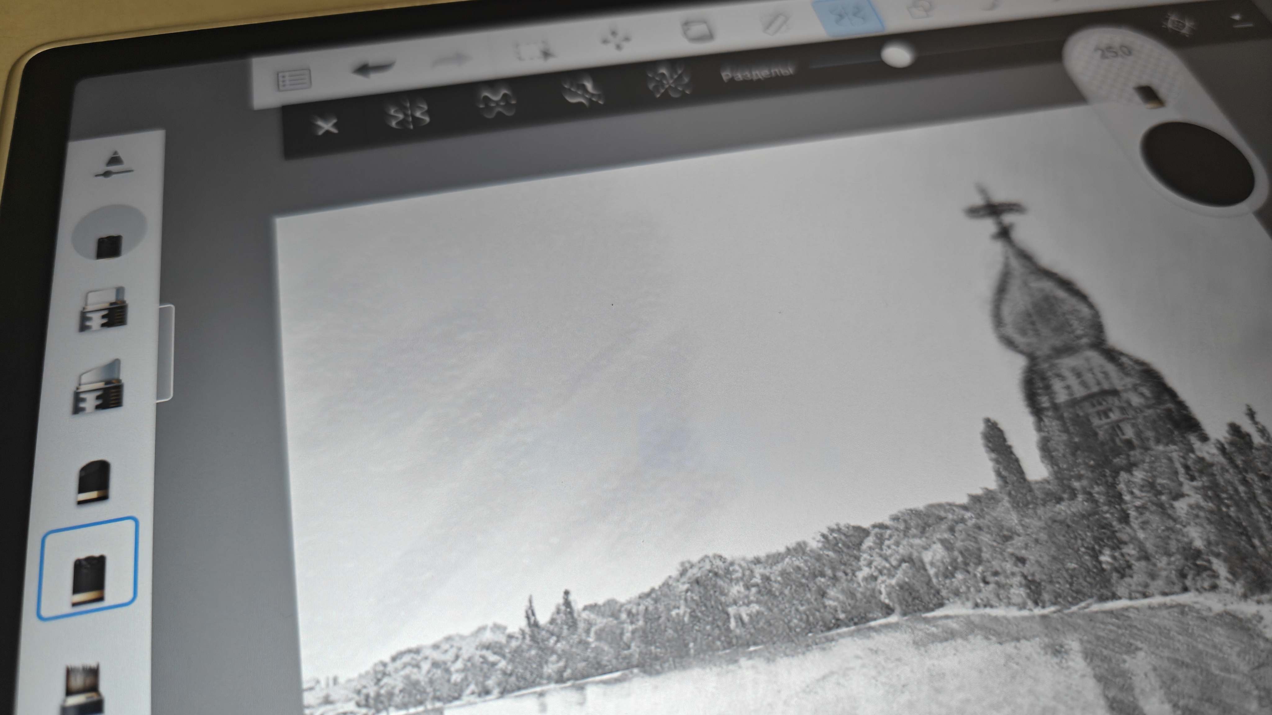 На нем можно спокойно рисовать, делать заметки, писать со стопроцентной передачей ощущения использования простого карандаша. Также очень любопытные ощущения от использования разнообразных кистей. Тут очень гибкие настройки и каждый подберет эффект под то, как он это видит. Также понравилось использовать карандаши для скетчинга. Как видно на третьем фото, тут даже имитируется оттиск карандаша на холсте. Даже в базовом ПО от XP-Pen широкий набор инструментов, включая затирки, автофигуры и ластики.