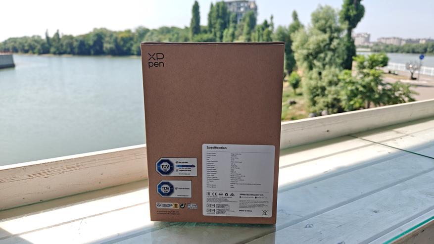 Приходит графический планшет в транспортировочной коробке, обычной, невзрачной, без надписей. Внутри находится основная коробка, оформленная в достаточно сдержанном стиле, без лишних красок, тут натуральный цвет и логотип компании. Очень плотный почти деревянный картон и красочное изображение устройства на лицевой стороне коробки. На задней стороне наклейка с техническими характеристиками.