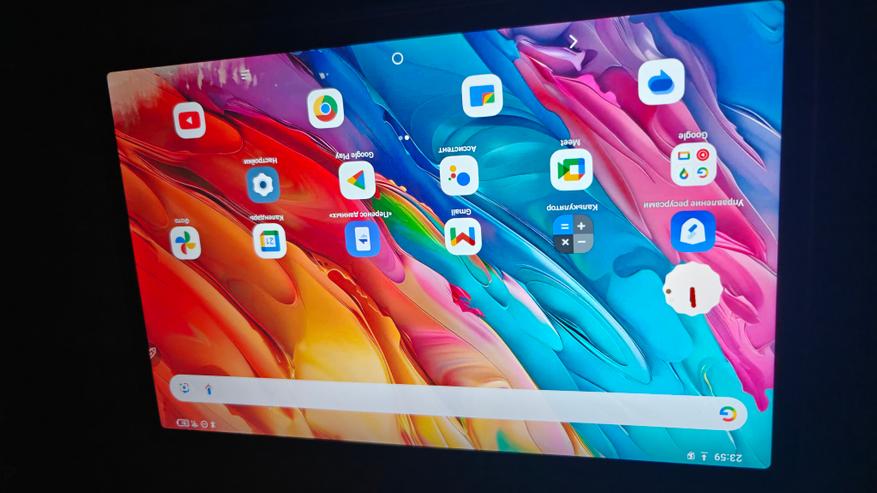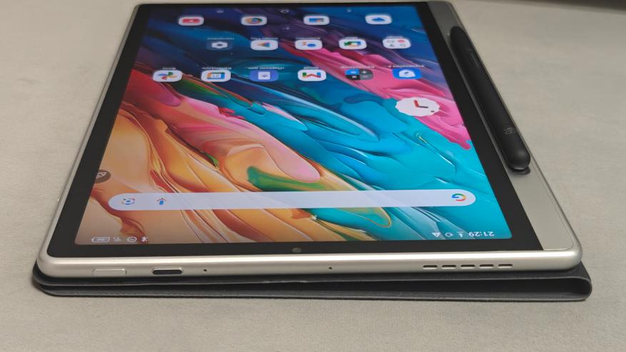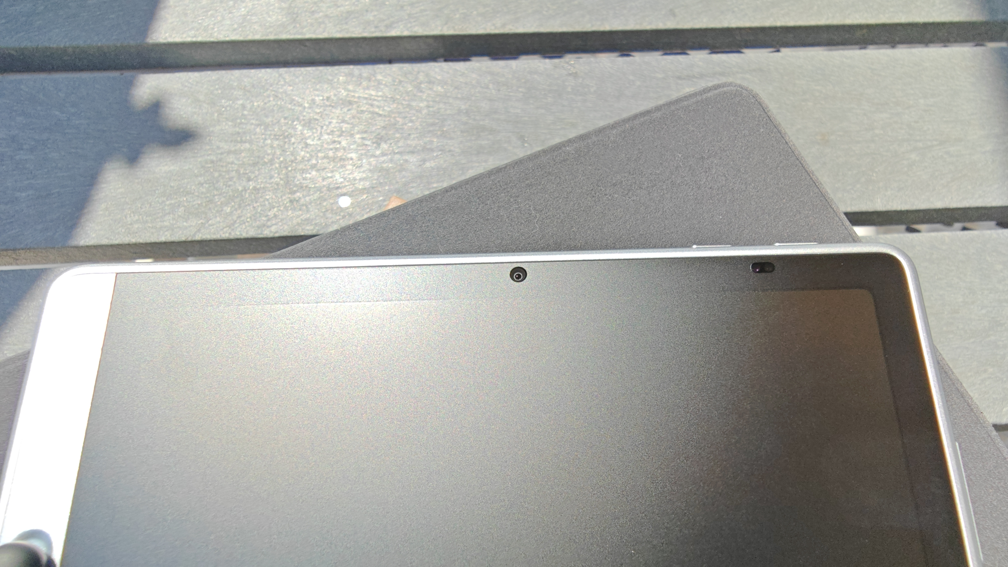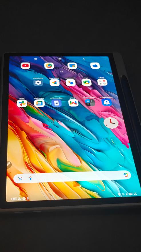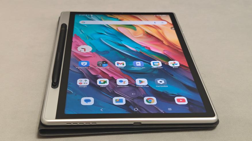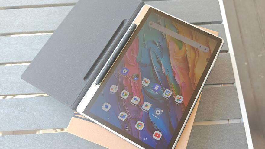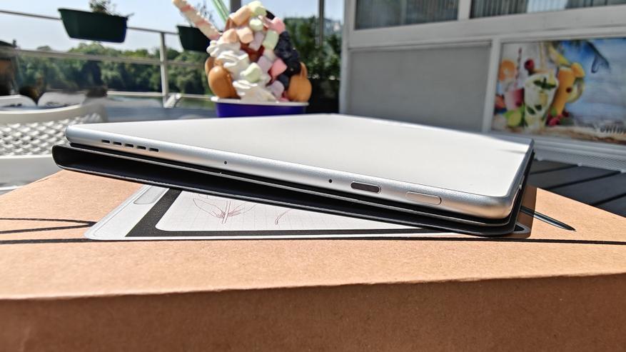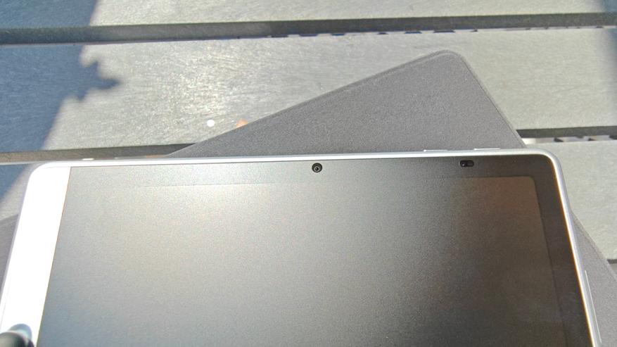 Дисплей имеет диагональ чуть меньше 11 дюймов и боковые рамки около 8 мм. На верхней рамке в центре притаилась фронтальная камера на 13Мп с фиксированным фокусом, а справа от нее датчик освещенности/приближения. Стекло матовое, приятное, чуть шершавое наощупь. Слева можно посмотреть, как виден дисплей на ярком кубанском солнце. Яркость дисплея 400нит, это не самое крутое значение, но в помещении использовать вполне комфортно.