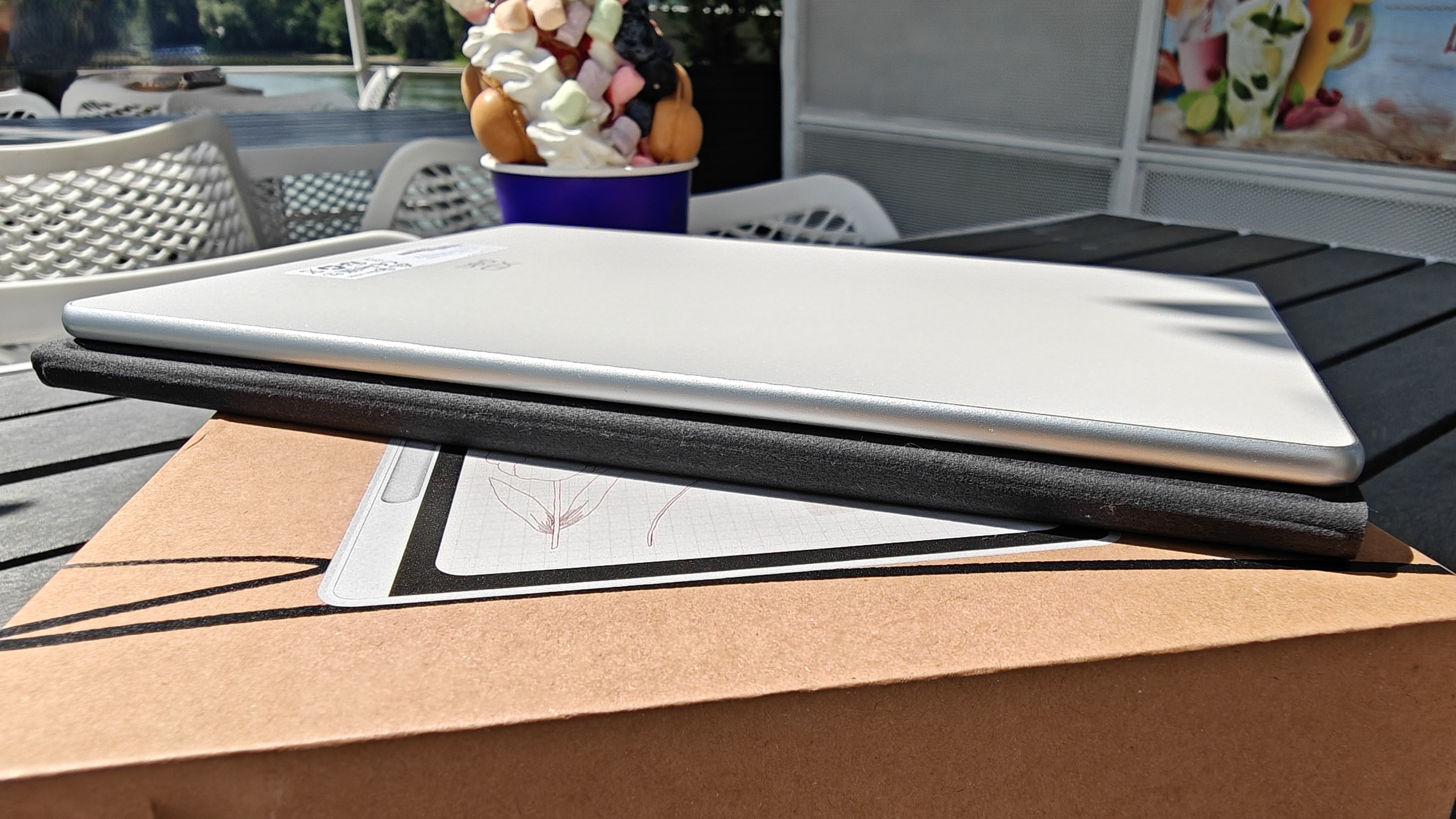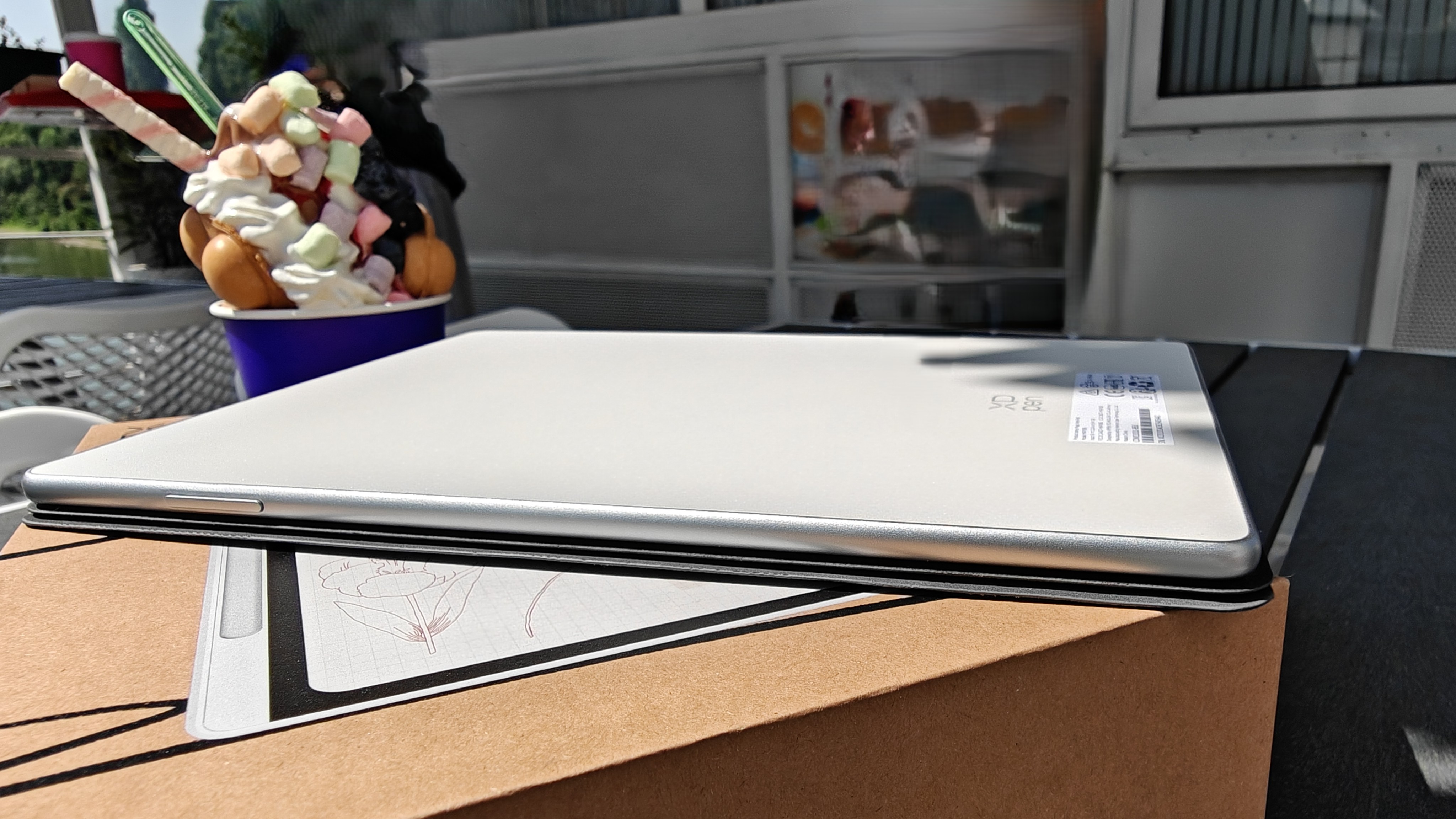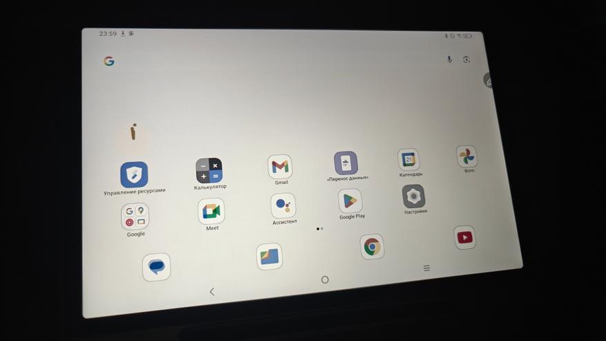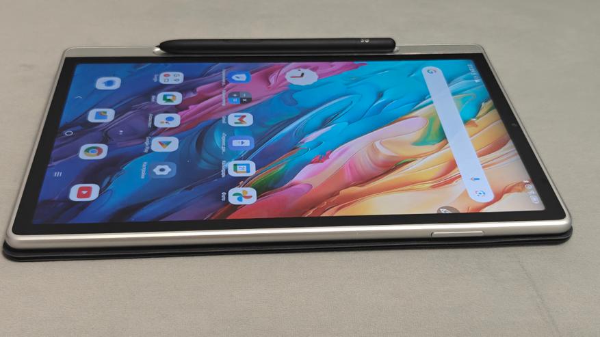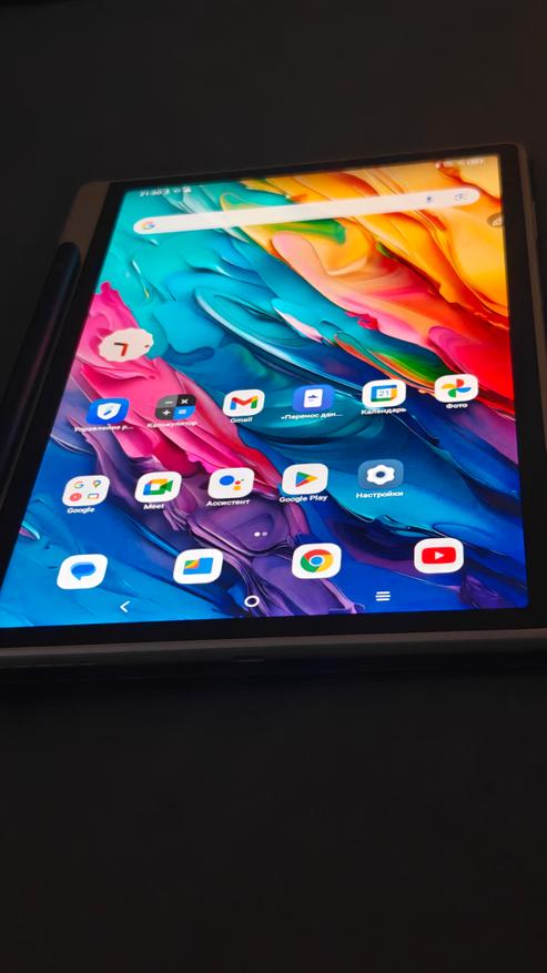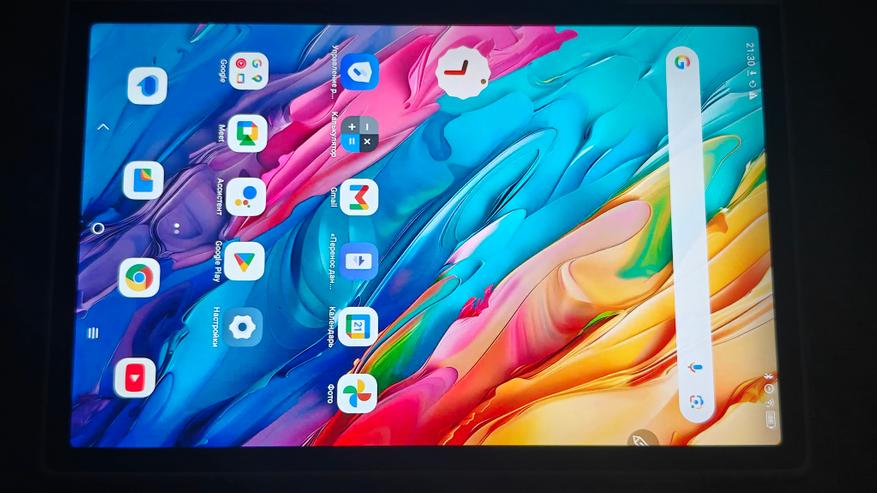 Дисплей имеет диагональ чуть меньше 11 дюймов и боковые рамки около 8 мм. На верхней рамке в центре притаилась фронтальная камера на 13Мп с фиксированным фокусом, а справа от нее датчик освещенности/приближения. Стекло матовое, приятное, чуть шершавое наощупь. Слева можно посмотреть, как виден дисплей на ярком кубанском солнце. Яркость дисплея 400нит, это не самое крутое значение, но в помещении использовать вполне комфортно.