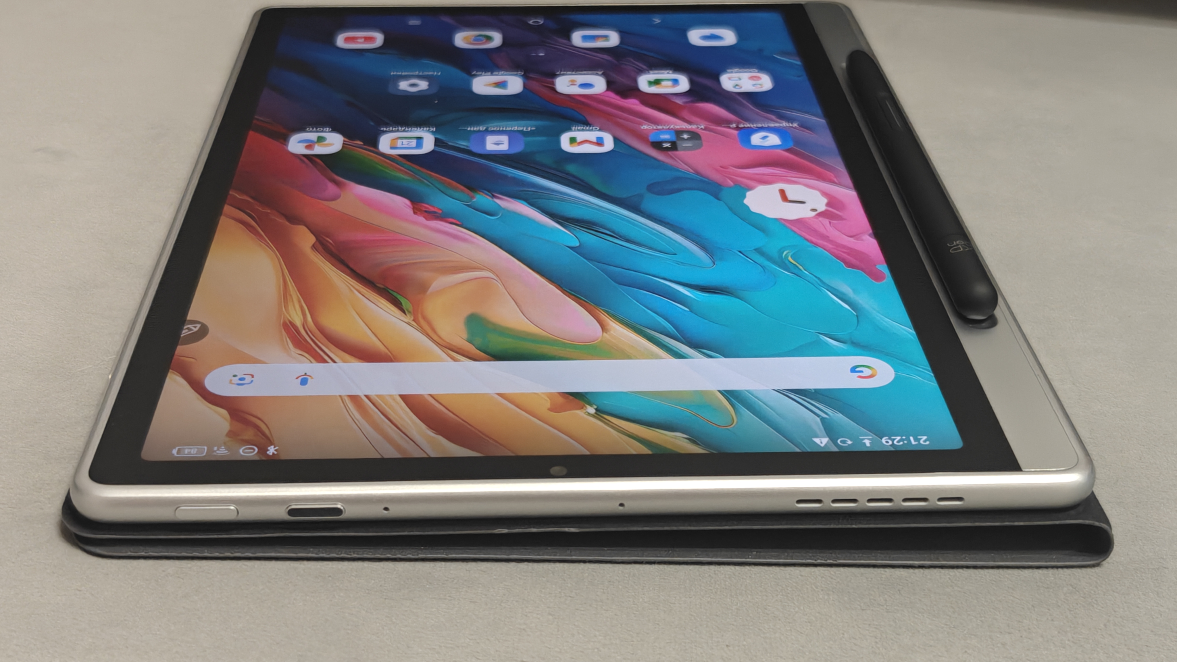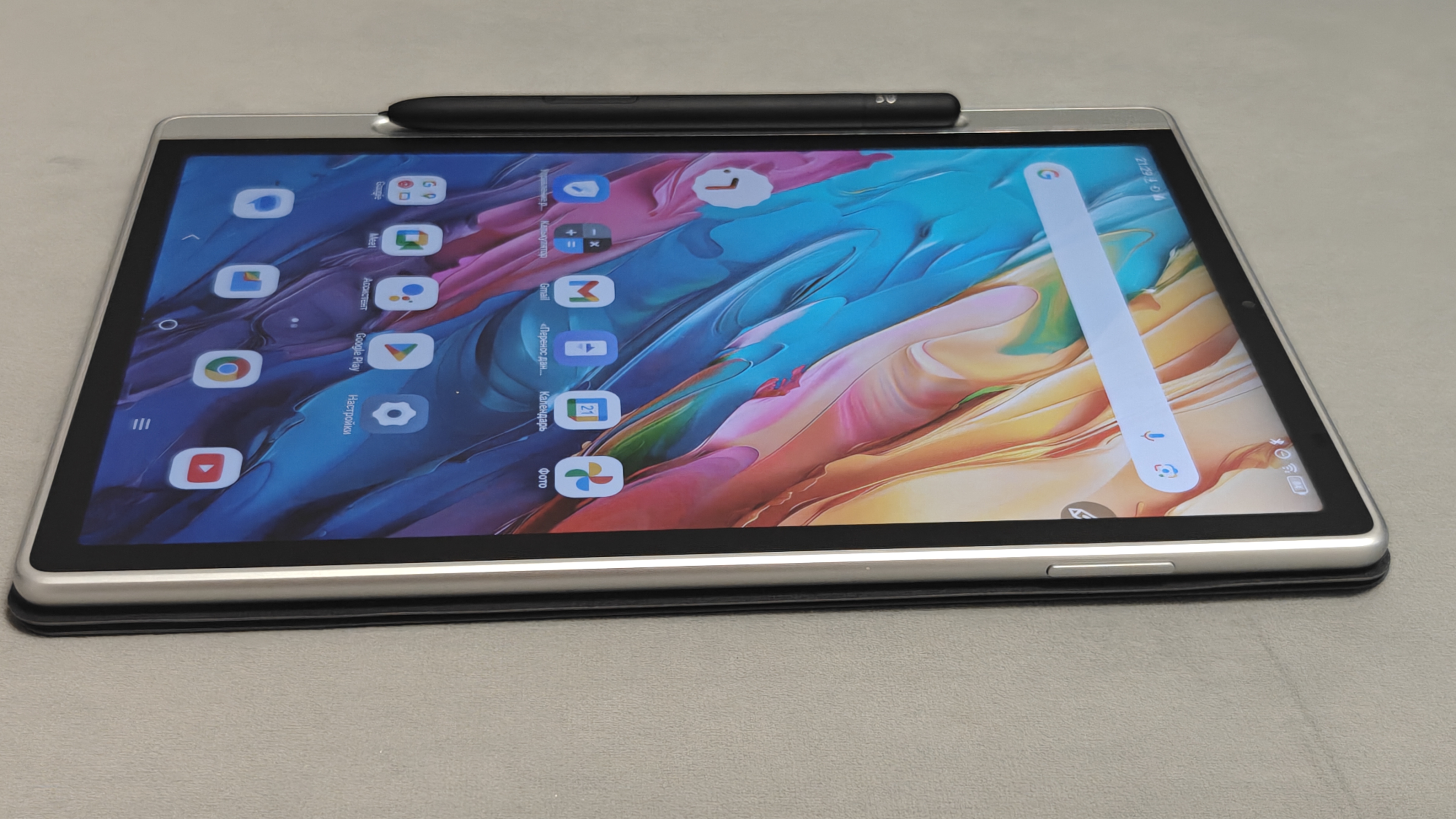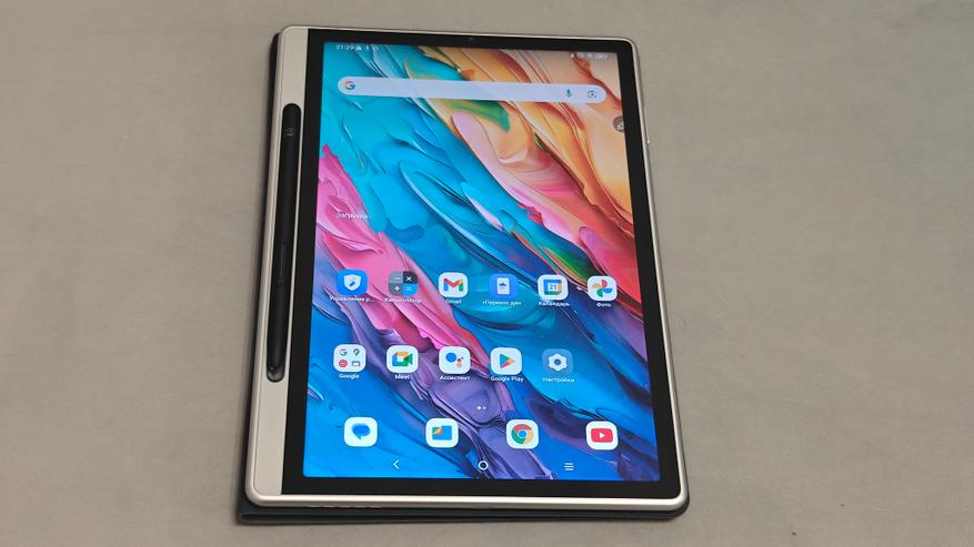 Внешний вид устройства в сборе начинается с магнитного чехла. Эстеты вроде моей жены оценят! Чехол имеет приятное, похожее на замшу, серое покрытие. Смотрится оно стильно и дорого, цвет имеет легкий перламутр. Выглядит это очень похоже на срез грифеля карандаша. На ярком солнце чехол красиво искрится. Внутренняя сторона чехла покрыта мягкой бархатистой тканью, что гарантирует сохранность дисплея. Задняя стенка чехла магнитная и плотно прилипает к планшету, надежно удерживая его в чехле. Боковых рамок у него нет, поэтому планшет остается ультратонким и не теряет видовых характеристик. Стиль и утонченность здесь прослеживаются в каждой детали.