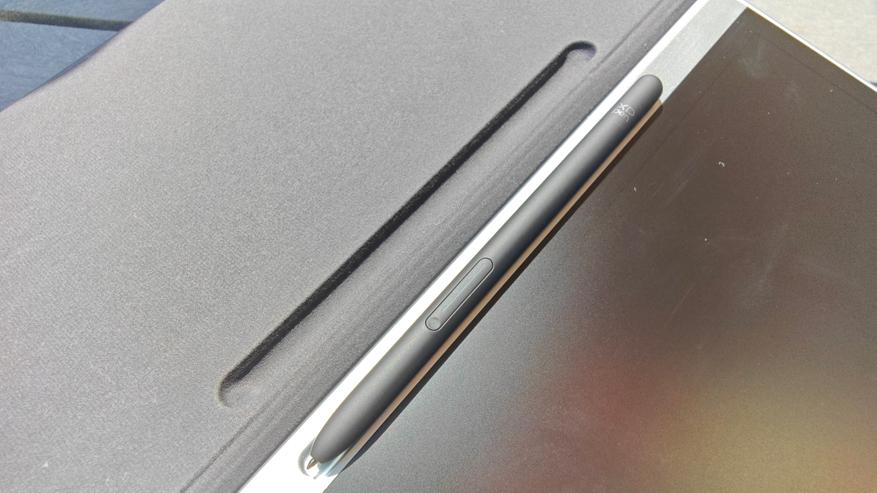 Слева возле дисплея предусмотрено пространство под размещение стилуса. На серебристой полосе в центральной части имеется углубление с магнитом, в которое вкладывается и примагничивается стилус.