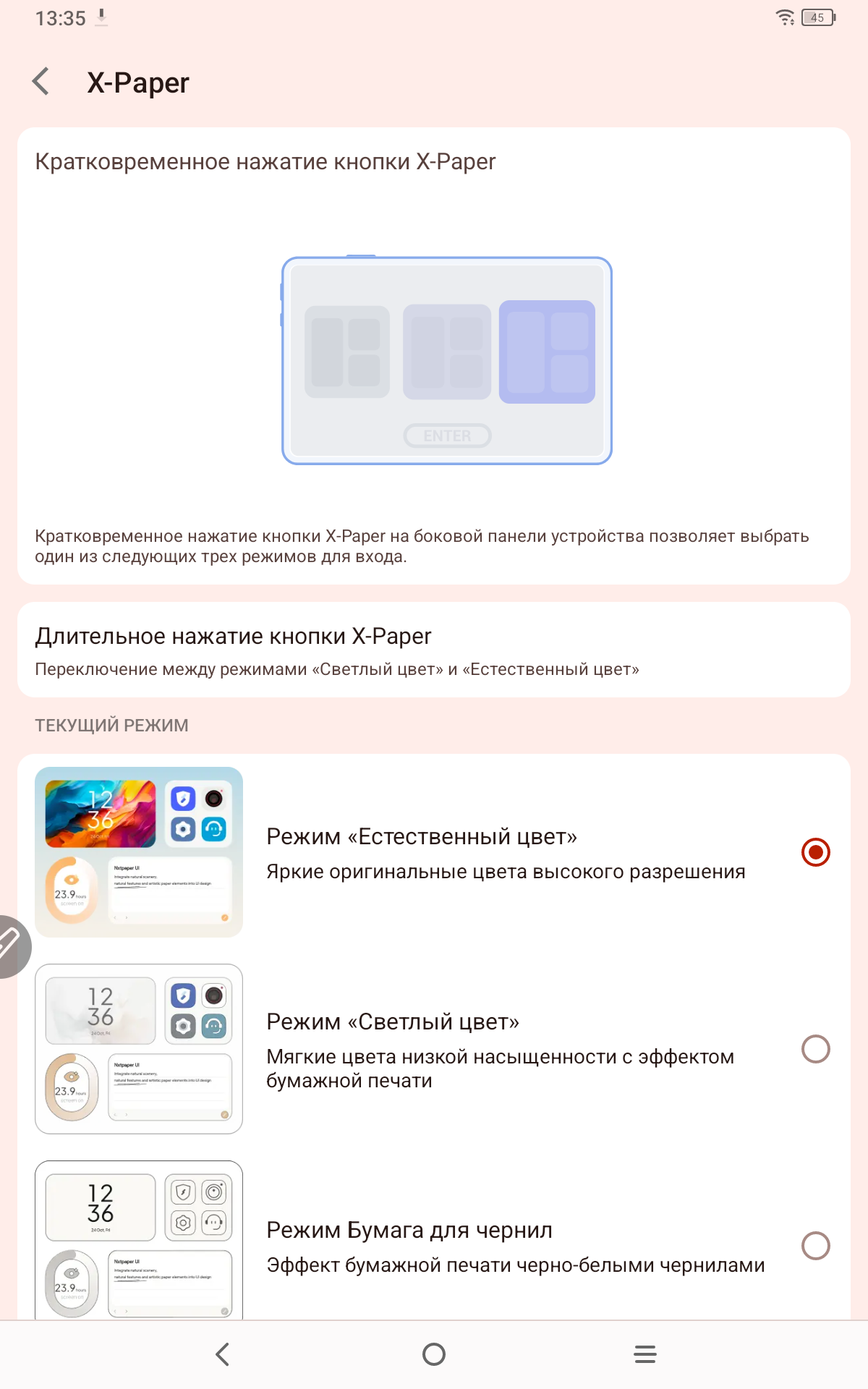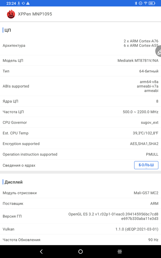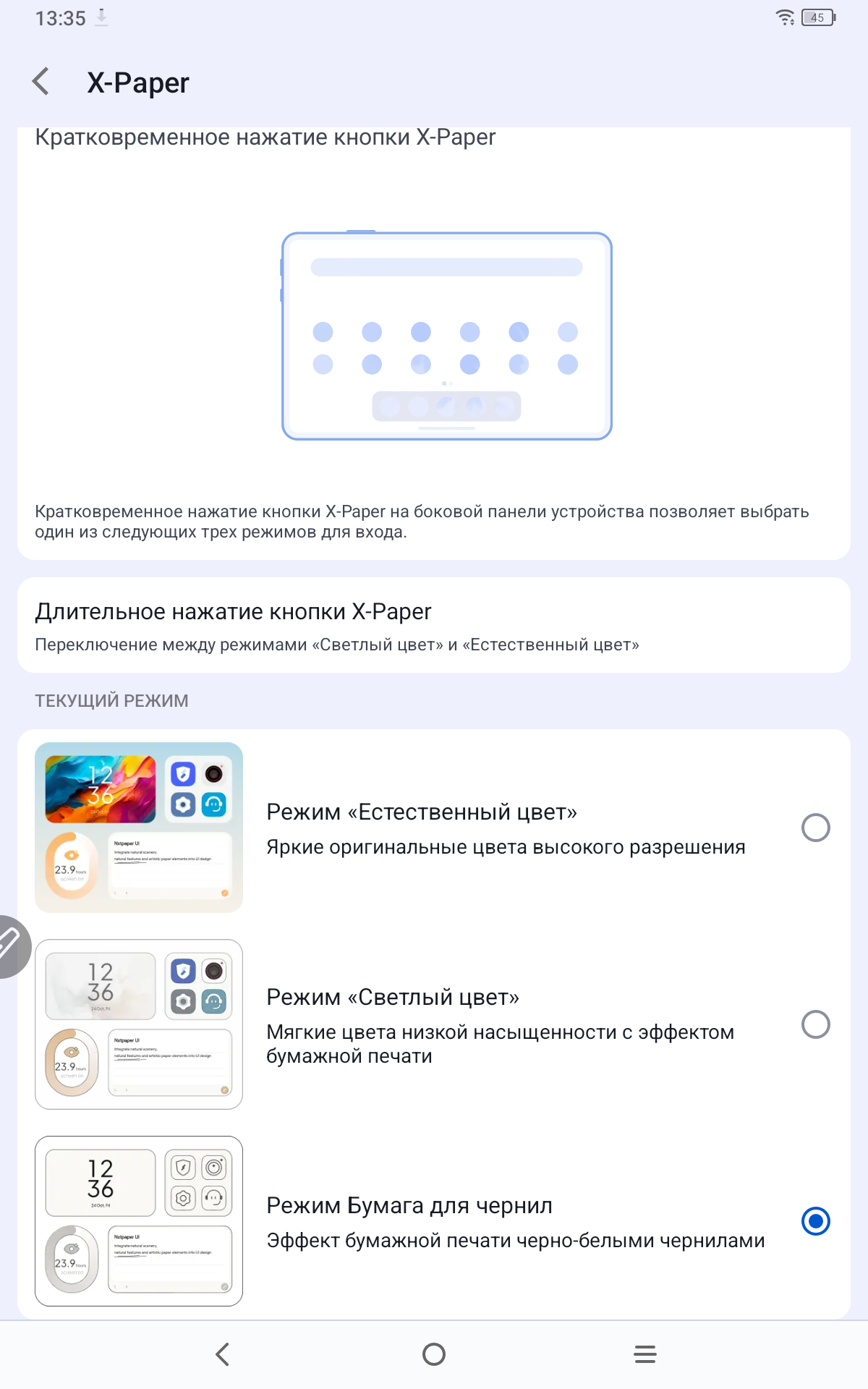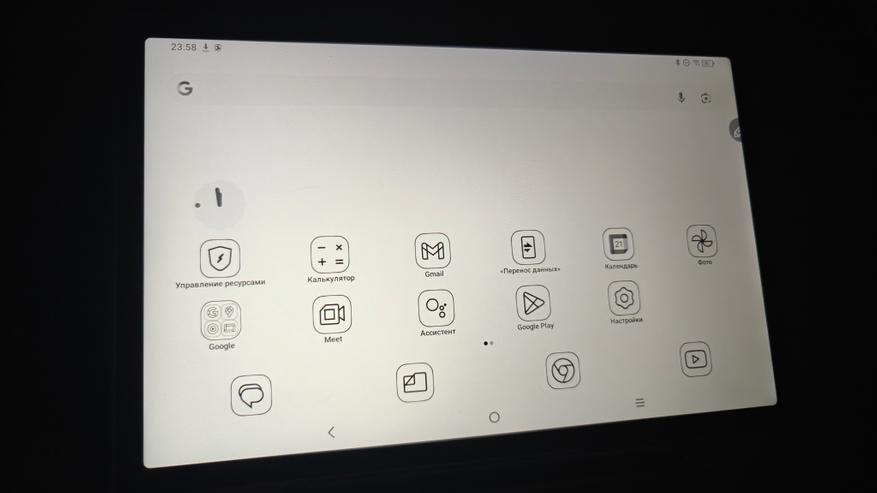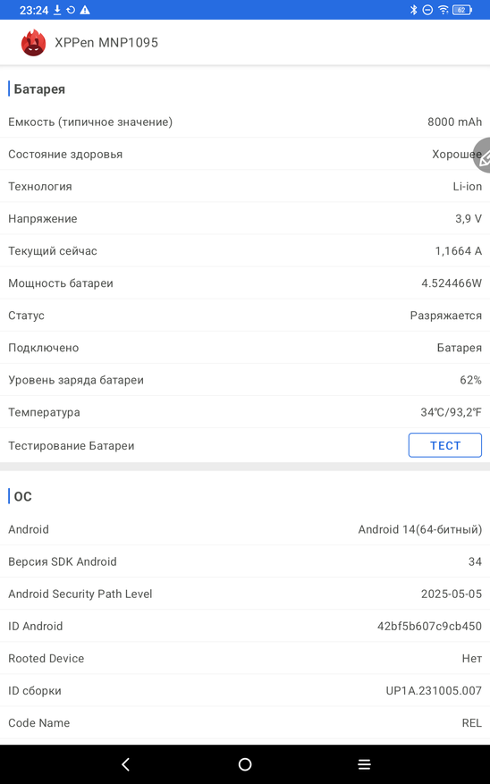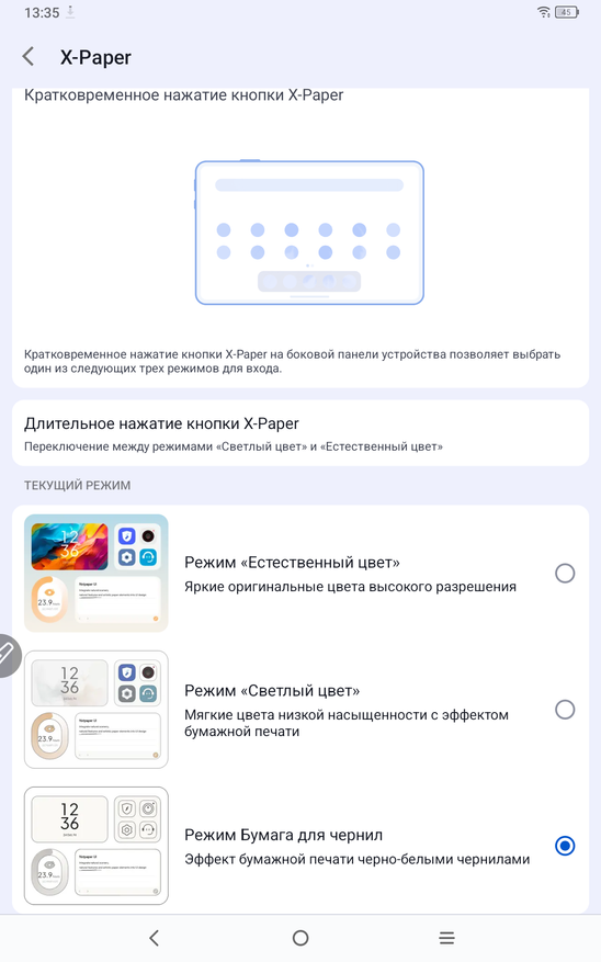 Теперь рассмотрим сам планшет именно как андроид устройство. Работает планшет на полноценном Android 14. Тут привычные элементы управления и корректно работающие жесты. В настройках устройства есть как привычные пункты, так и разделы именно производителя XP-PEN. Есть тут настройка особых режимов отображения, чтобы вы могли подобрать режим для себя. Можно читать электронные книги в черно-белом варианте, работать и делать записи в светлом, и играть и смотреть фильмы в насыщенных цветах. На устройстве занято 25 ГБ памяти из 128 ГБ. Еще есть особая умная кнопка, которая вызывает специально назначенные инструменты. В остальном тут привычное использование андроид планшета.