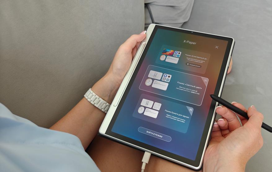 Стоит уточнить, что рисования на этом планшете — это что-то космическое. Есть ощущение, что у нас настоящий бумажный скетчбук. Для эффекта ведения грифелем по бумаге использован патентованный стилус X3 Pro Pencil 2, который имитирует степень нажатия грифелем аж в 16000 степеней. Стилус шикарно лежит в руке, имеет сменные грифели (в комплекте вместе со съемником), а также функциональную кнопку. Его главная особенность — его не нужно перезаряжать, он работает сразу из коробки. Также он удобно располагается в пазе в корпусе при помощи магнитов. Достаточно просто положить его где-то рядом и он сам займет правильное положение. А еще у него приятный вес и материалы, он ощущается как премиальная шариковая ручка, нежели просто стилус.