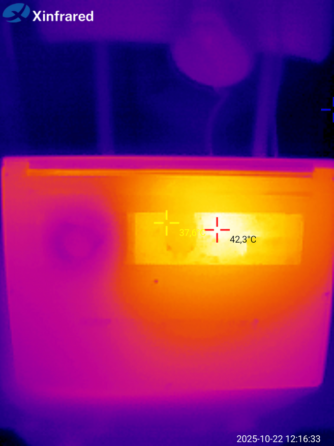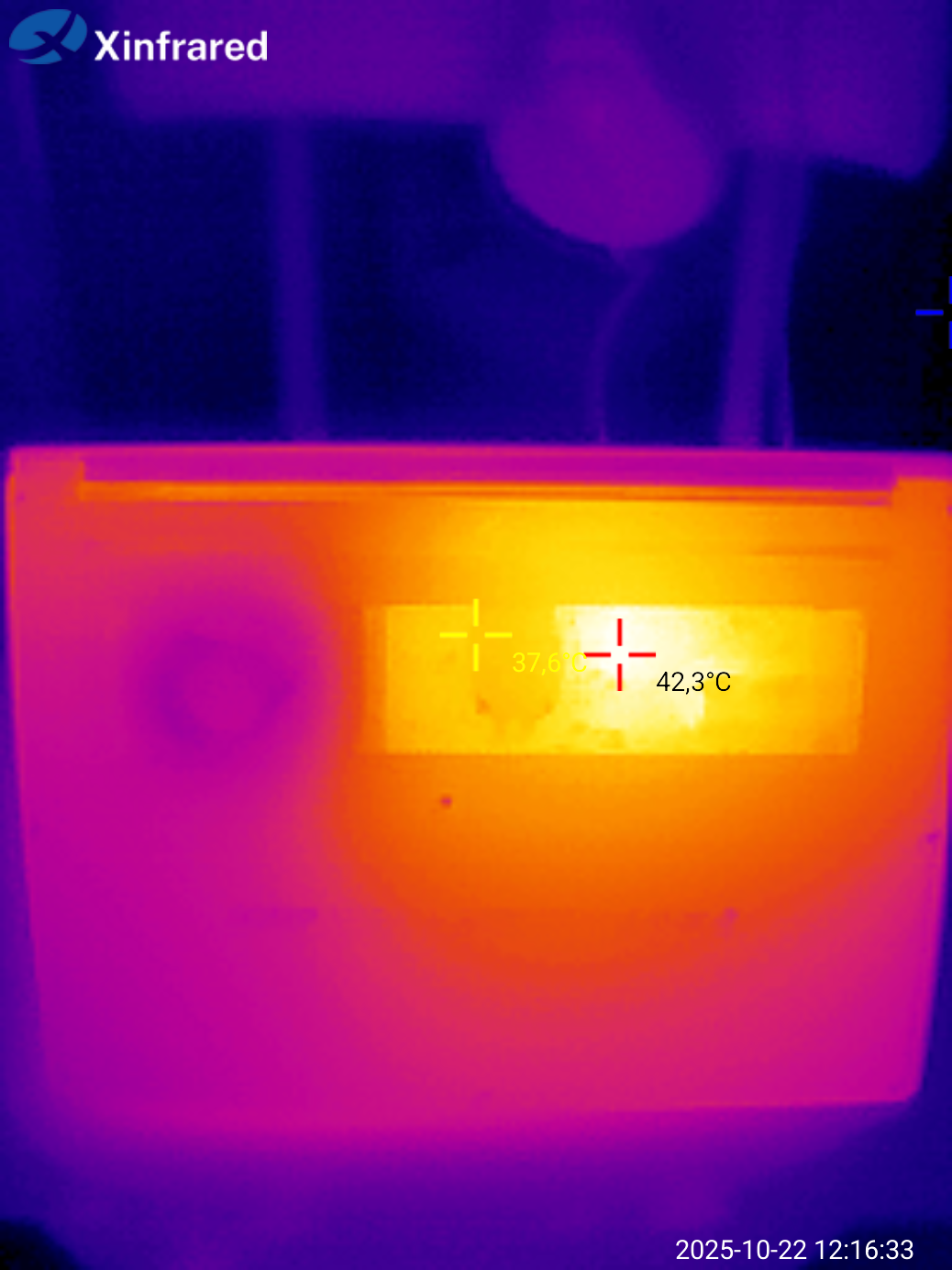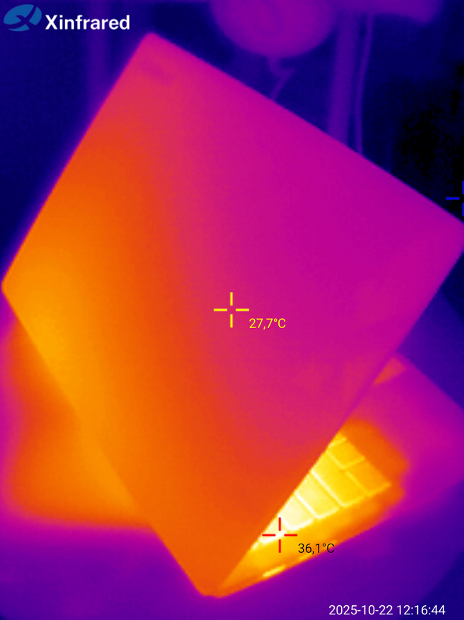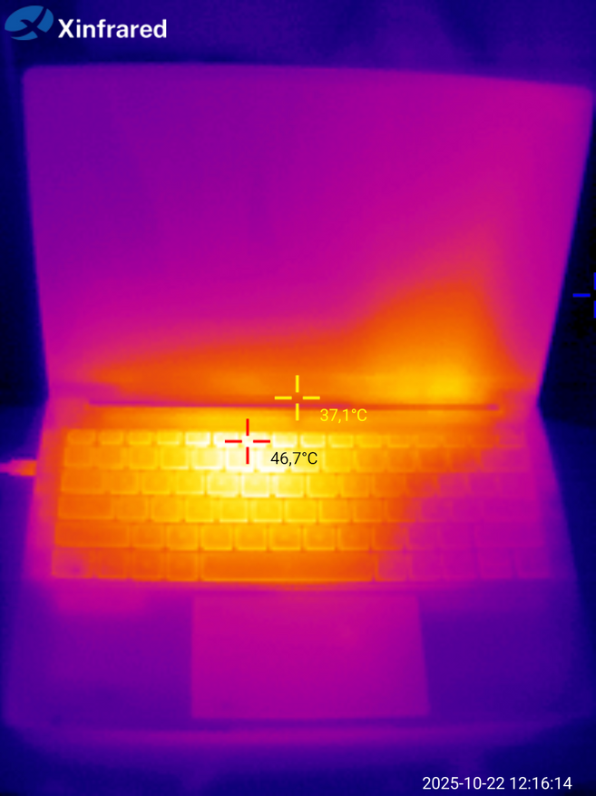 При работе нагрев и шум получаются умеренные. Я бы даже сказал — скромные. По крайней мере, приложение не зафиксировало уровень шума выше, чем 30-32 децибела. Отмечу небольшой, едва заметный нагрев в области клавиатуры (видно на термоснимках).