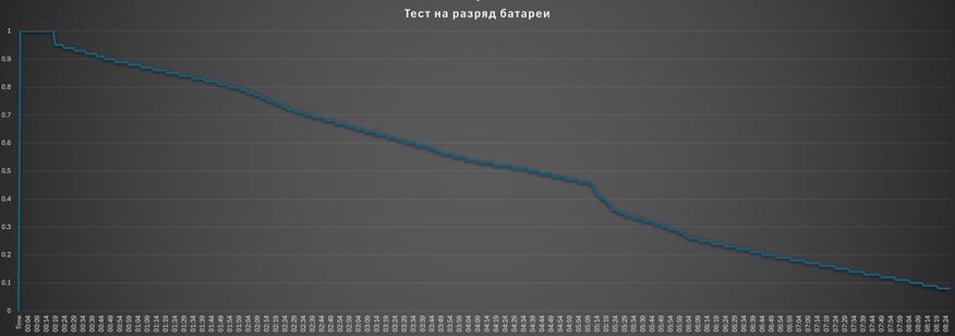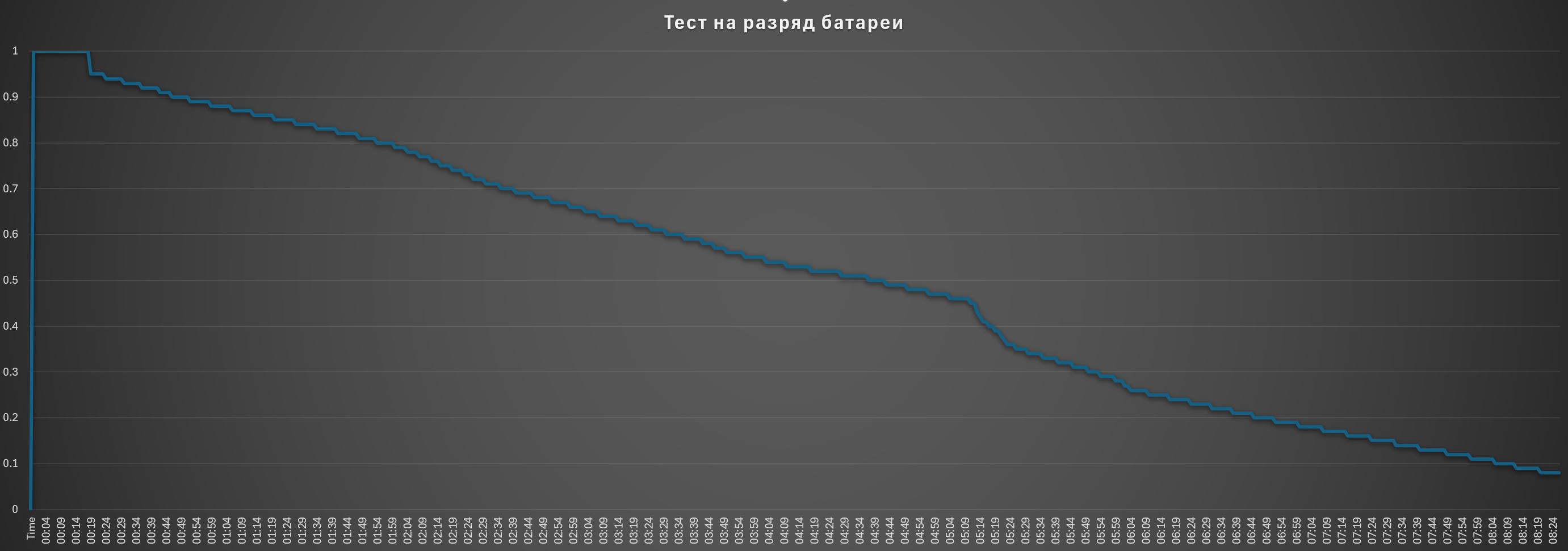 Еще один стандартный тест — это проверка времени работы ноутбука от встроенной батареи. Запускаю на полностью заряженном ноутбуке (с подключенной зарядкой — очевидно) различные приложения или бенчмарки, которые позволяют постоянно поддерживать среднюю нагрузку таким образом, как обычно работает пользователь (запуск приложений/браузера, работа с файлами). Примерно на второй трети теста запустил другой, более интенсивный бенчмарк (имитация работы в офисе) — это видно по чуть изменившейся интенсивности разряда. Так что все восемь часов непрерывно ноутбук был загружен — хороший результат для ноутбука на производительном процессоре Ryzen. Отмечу, что это экономичный режим работы, так как в сбалансированном будет около 5-7 полноценных часов работы (зависит от доступа через WiFi и загрузки процессора).