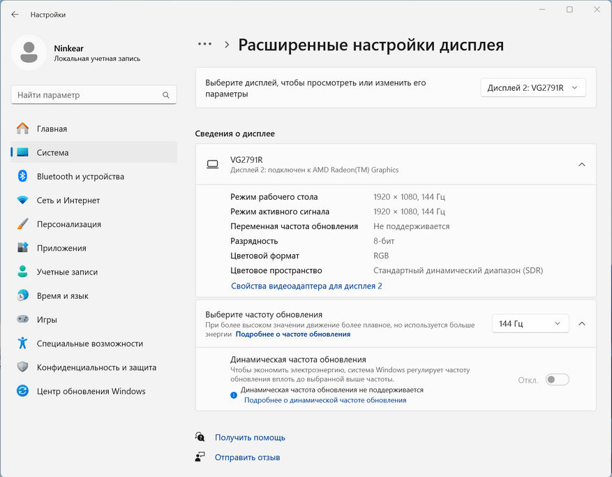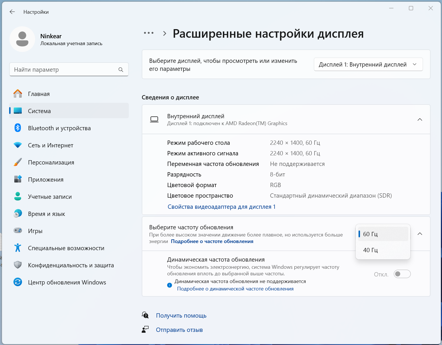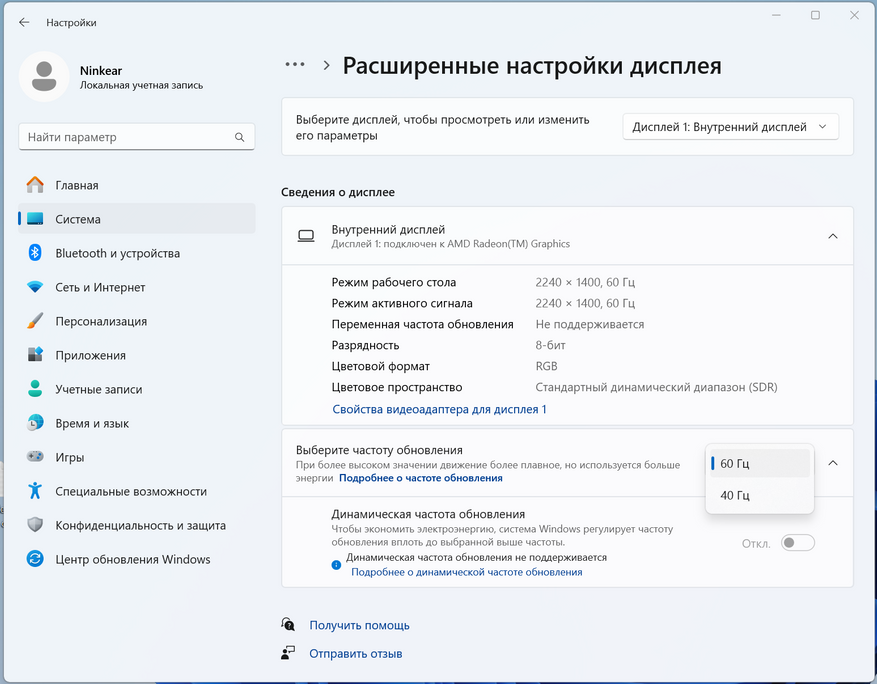 Скриншот с системной информацией о ноутбуке Ninkear S14. Также прокомментирую момент с частотой обновления экрана: для штатной матрицы это 60 Гц, а для внешнего дисплея может быть и выше — на уровне 120 … 144 Гц.