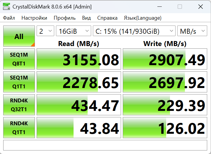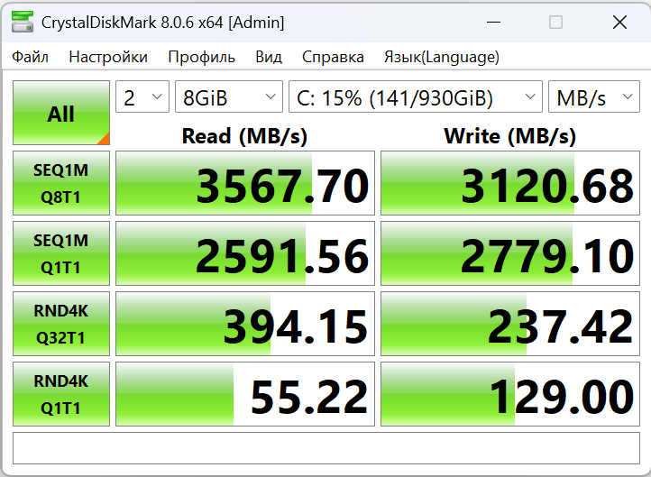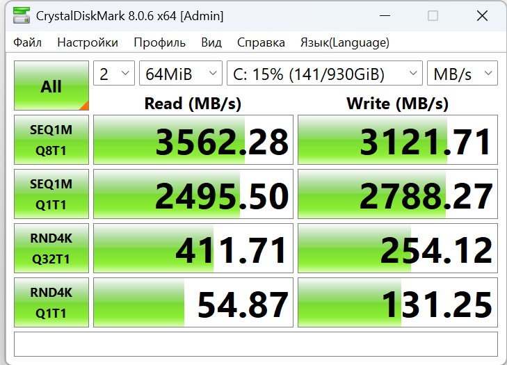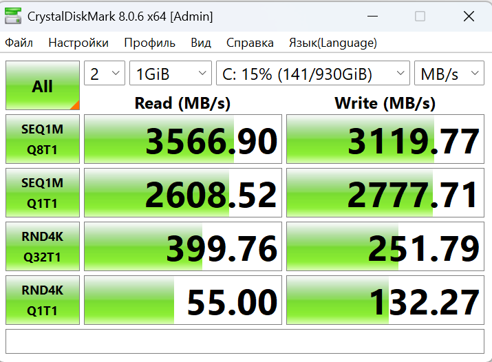 Твердотельный накопитель, который штатно поставляется в данной комплектации обеспечивает высокую скорость загрузки приложений и доступа к файловой системе. Типичные значения — это 3000+ МБ в секунду.