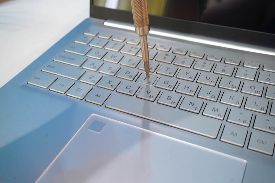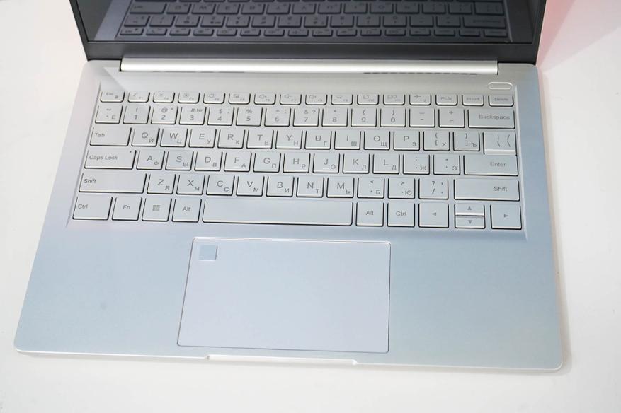 Клавиатура русифицированная, с подсветкой, с удобными клавишами. Нажатие мягкое и четко срабатывает, но ход клавиш короткий, как и у всех подобных ноутбуков. Обращаю внимание, что сенсор отпечатка пальцев встроен в тачпад — его хорошо видно в левом верхнем углу тачпада.