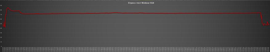 Плотный часовой тест при стопроцентной нагрузке на процессор. Такой стресс тест дает возможность выявить слабые стороны или явный перегрев. Так как у меня ноутбук лежит на мягком коврике, то после первых 5 минут работы я его приподнял — хорошо видно «ступеньку» в начале теста. Итог — часовой стресс тест ноутбук выдержал, средняя температура 75-78 градусов (с пиками до 80+), без сбоев/без троттлинга. Летом и при регулярной длительной нагрузке имеет смысл приобрести подставку, улучшенную циркуляцию воздуха под нижней крышкой ноутбука — весьма заметно при полной нагрузке. А вот штатной системы охлаждения, в принципе, для этого ноутбука достаточно. В любом случае, это хороший показатель для ноутбука с тепловыделением процессора на уровне 35 Вт.