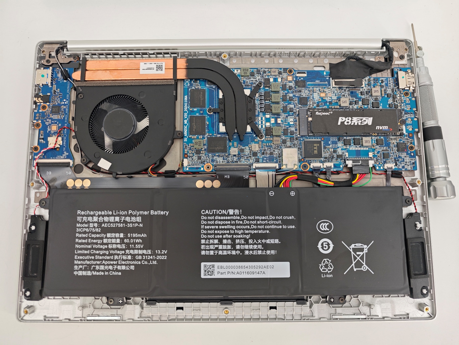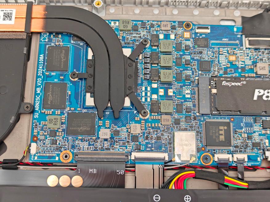 Из-за плотной компоновки и скромных размеров материнской платы в этой модели отказались от слотов SO-DIMM памяти. Чипы ОЗУ распаяны рядом с процессором. А вот SSD заменить не составит труда — слот стандартный М.2 формата 2280. Имеет смысл установить что-то на 2 или даже 4 Гб. Еще отмечу увеличенную по ёмкости батарею — именно она позволяет ноутбуку работать дольше обычного.