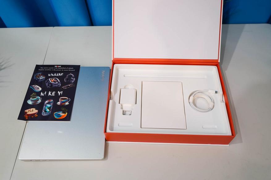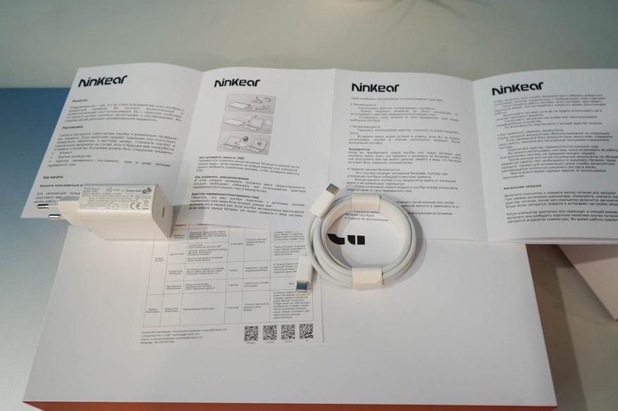 Распаковка начинается с приличной коробки бело-красного цвета. Кстати, неплохой вариант в качестве подарка — все выглядит более чем презентабельно. Есть наклейки (для собственного стиля оформления), есть инструкция. Заряжается этот ноутбук от USB — в комплекте есть соответствующий кабель и зарядка.