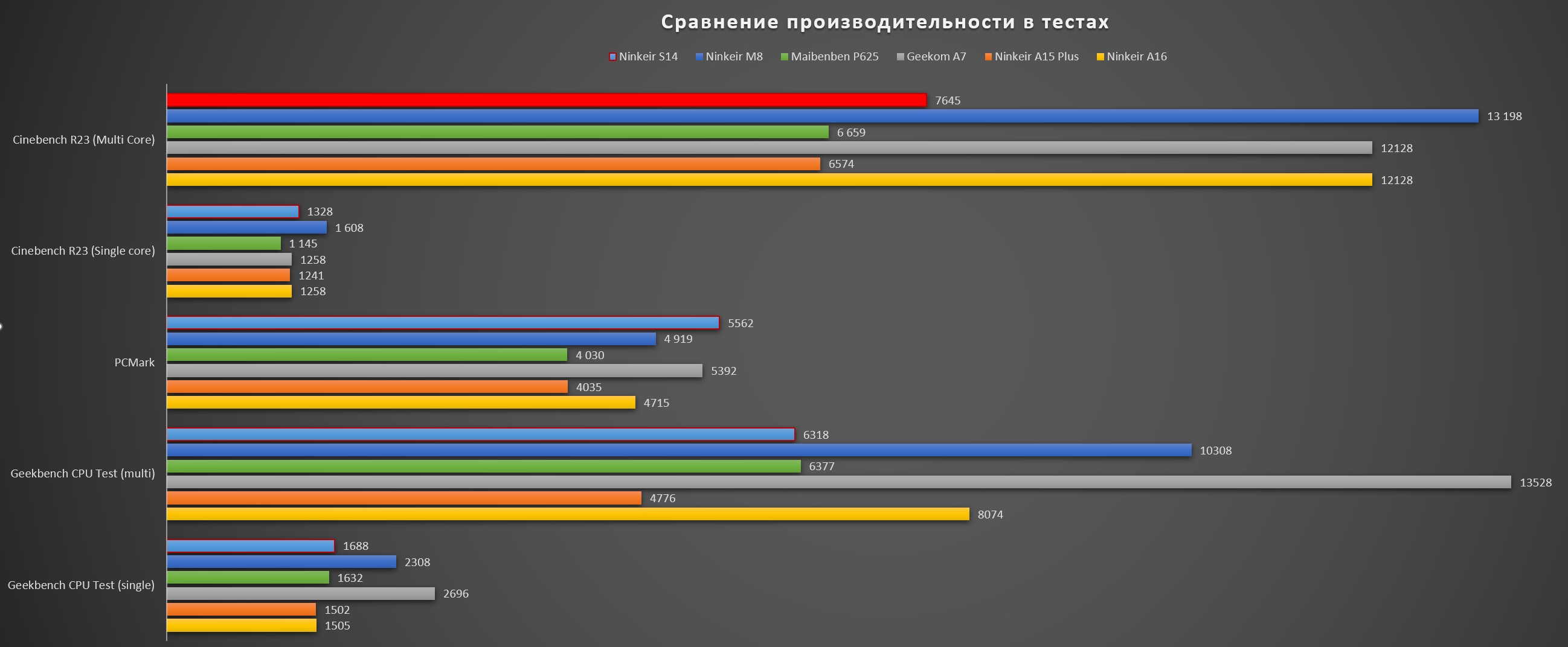 Различных тестов, позволяющих сравнить относительную производительность платформы Ninkear S14 много, чтобы не перегружать обзор приведу сводную таблицу с результатами.