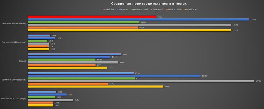 Далее, гистограмма для сравнения вычислительной мощности ряда ноутбуков и мини ПК, которая дает возможность сравнить относительный уровень. Стоит отметить, что мини ПК этого же бренда — Ninkear M8 оказался несколько мощнее, особенно в игровом плане, если так можно говорить о встроенных iGPU. Примерно то же самое можно сказать и про ноутбуки Ninkear А16 и Ninkear А15 Plus.