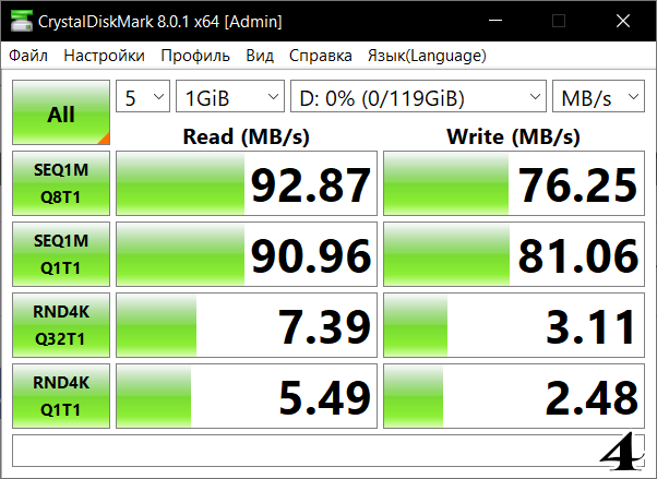 SD слот поддерживает карты памяти: SDHC, SD Card, RS-MMC и MMC Micro. TF слот поддерживает карты памяти: MicroSD, MicroSDHX и MicroSDXC. Заявленная производителем максимальная скорость 104MB/s. При тестировании TF слота я использовал карту памяти Samsung Evo Plus MicroSDXC 128GB. Скорость чтения составила 92MB/s, а записи 76MB/s. При тестировании SD слота использовал ту же самую карту памяти, но с SD адаптером. Скорость у слотов SD и TF ± одинаковая.