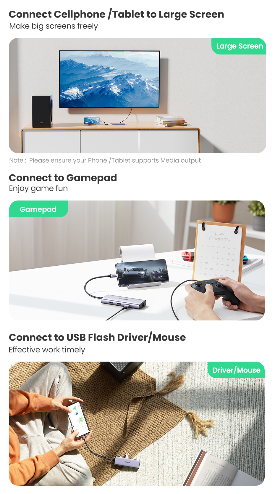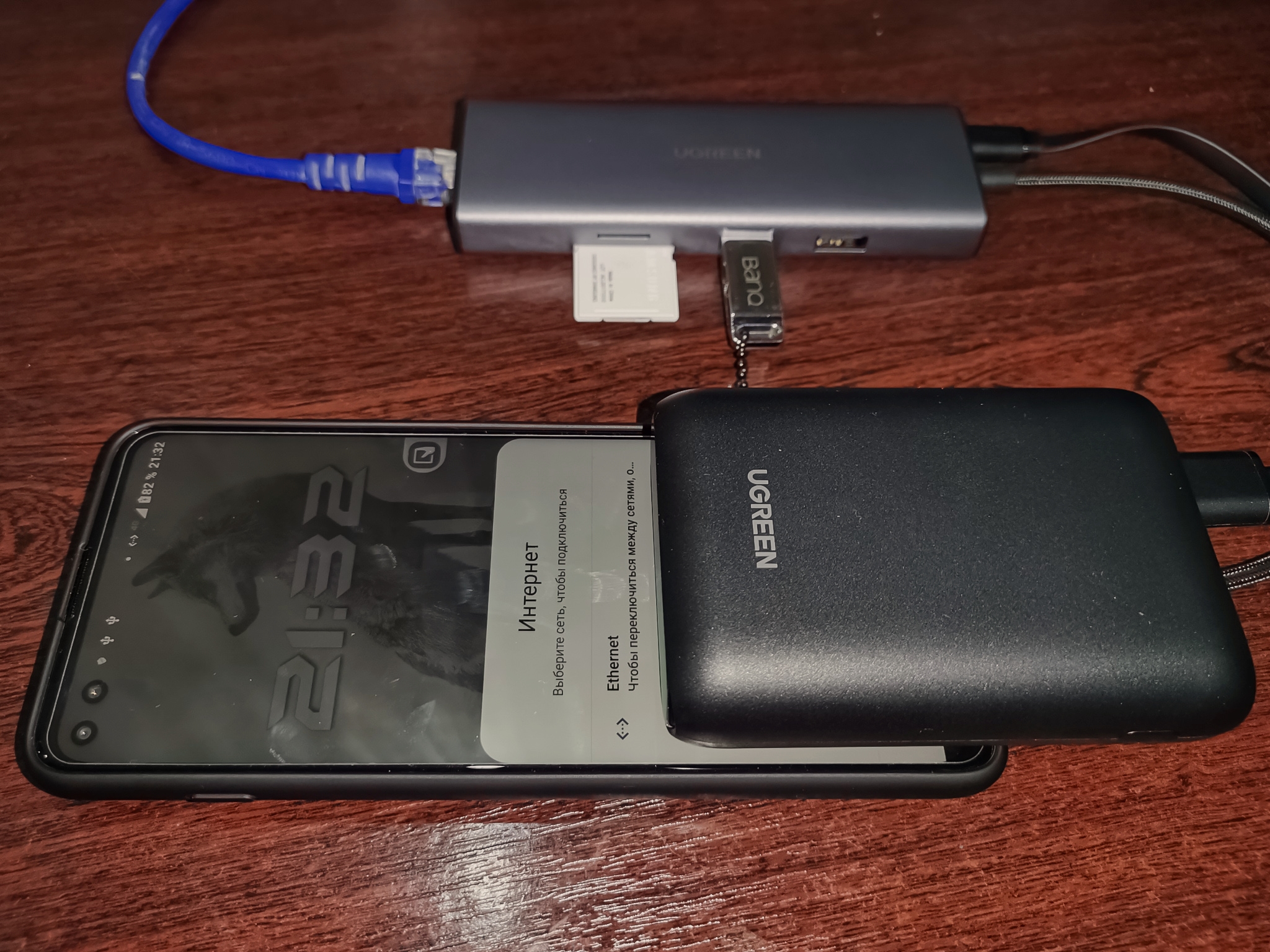 Телефон без проблем обнаруживает все устройства подключённые к портам адаптера. Если вдруг какой-то накопитель (SSD, флешка или карта памяти) не будет обнаружен (или будет обнаружена ошибка), то это означает что данный телефон не поддерживает файловую систему конкретного накопителя. Ещё следует учесть то, что далеко не все телефоны поддерживают вывод изображения через порт type-c. Телефон может заряжаться через адаптер как от зарядного устройства PD, так и от QC. При отключении подачи питания на PD порт адаптера, на несколько секунд обрывается связь HDMI и RJ45. При подключении подачи питания на PD порт адаптера связь не обрывается. Во время работы адаптер не пищит, но может быть немного теплым. Энергопотребление адаптера в простое составляет 0.33W.