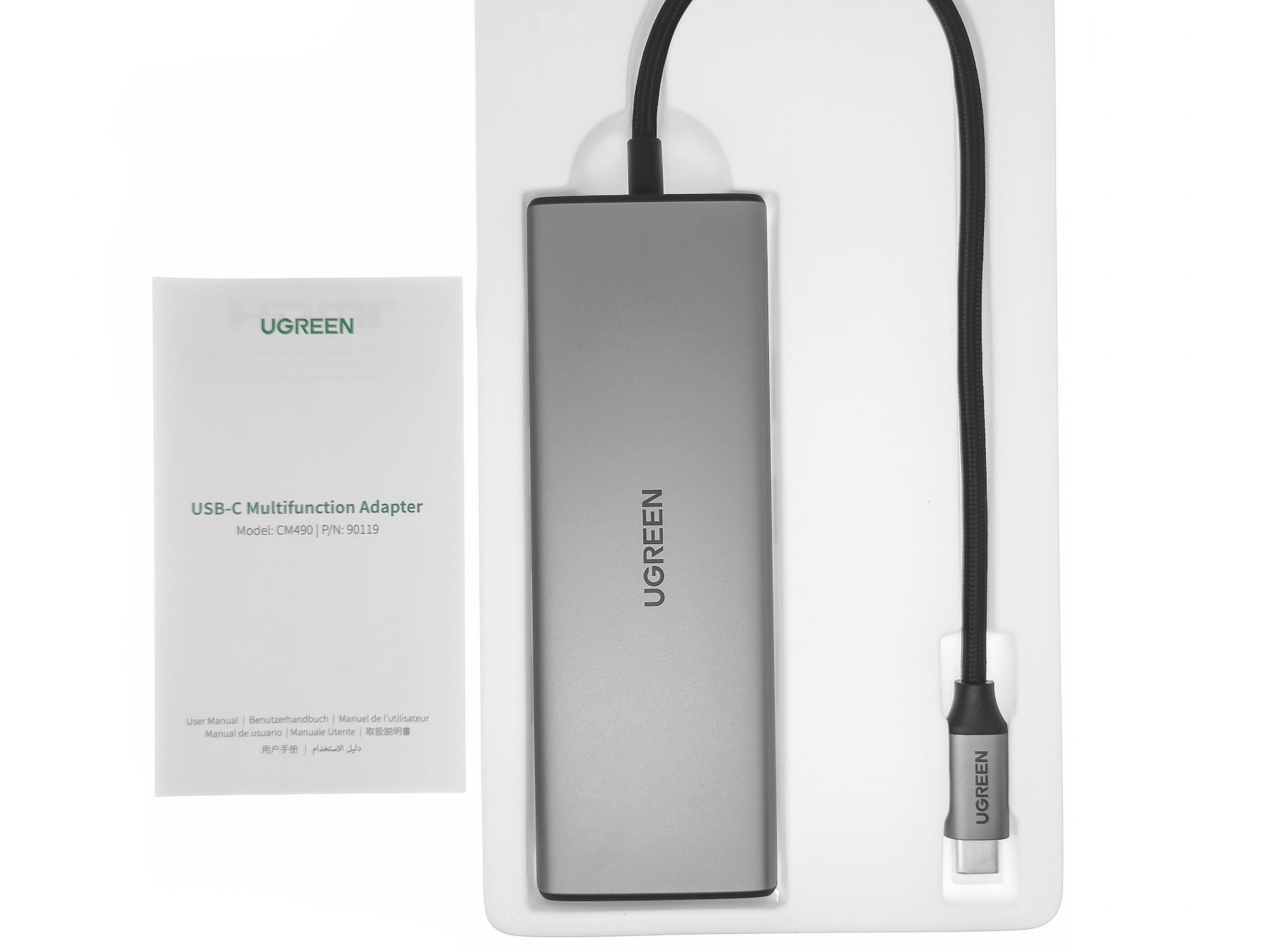 Адаптер поставляется в стандартной для подобного рода устройств "югриновской" упаковке. На лицевой стороне упаковки находится изображение адаптера, а так же там подчеркиваются такие его функции как поддержка двух мониторов, HDMI 4K/60Hz и Power Delivery. С обратной стороны упаковки есть ещё одно, более детальное изображение адаптера, а также там можно ознакомиться с контактными данными производителя. Внутри упаковки адаптер (с надетым на type-c коннектор защитным колпачком) помещён в пластиковый лоток. Помимо адаптера в коробке есть ещё инструкция.