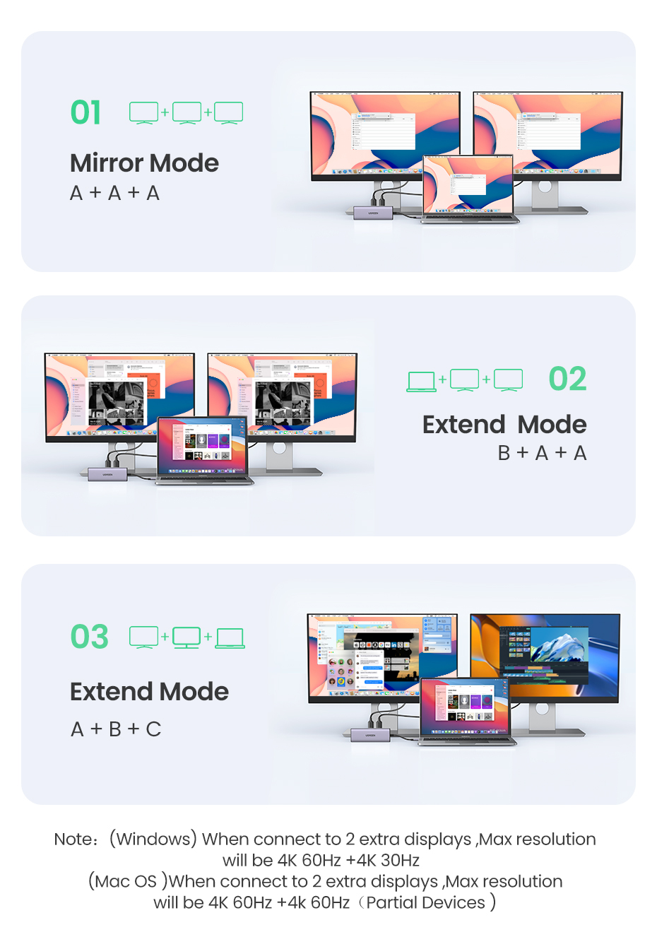 Если используется операционная система Windows, то при подключении к двум внешним мониторам на один из них будет выводиться изображение в максимальном качестве 4K/60Hz, а на второй 4K/30Hz. Если же используется операционная система Mac OS, то на оба монитора изображение будет выводиться в максимальном качестве 4K/60Hz. Чтобы выводить изображение в качестве 4K/60Hz USB-C порт ноутбука должен поддерживать DP1.4. При поддержке DP1.2 качество будет снижено до 4K/30Hz.