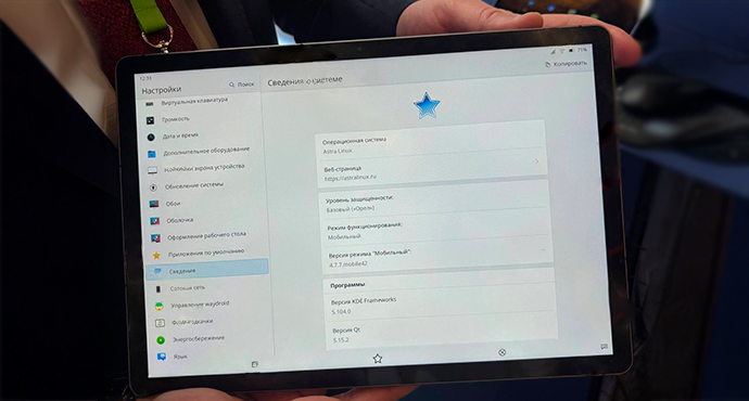 Размеры устройства 289*202 мм, при толщине корпуса в 11 мм. Общий вес составит почти 850 г. В планшете будет установлена основная камера на 16 Мп и селфи-камера на 13 Мп. ОС Astra Linux Mobile поддерживает работу с Android-приложениями через специальный эмулятор, а также содержит большое количество программных продуктов. В операционной системе реализована встроенная защита, прошедшая сертификацию, поэтому планшет может использоваться в государственных структурах страны. В дальнейшем планируется расширение линейки с экранами по 8 и 10 дюймов, а также модернизация корпуса к защите по стандарту IP65.