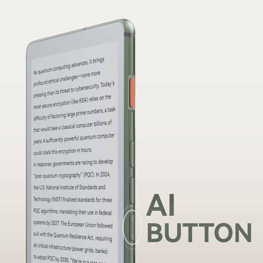 Устройство оснащено экраном E Ink Carta 1300 диагональю 6,13 дюйма с разрешением 824 на 1648 пикселей. Основной особенностью ридера стала выделенная физическая кнопка для быстрого доступа к функциям искусственного интеллекта. При нажатии на неё пользователь может обратиться к одному из трёх чат-ботов: OpenAI GPT, Google Gemini или DeepSeek.