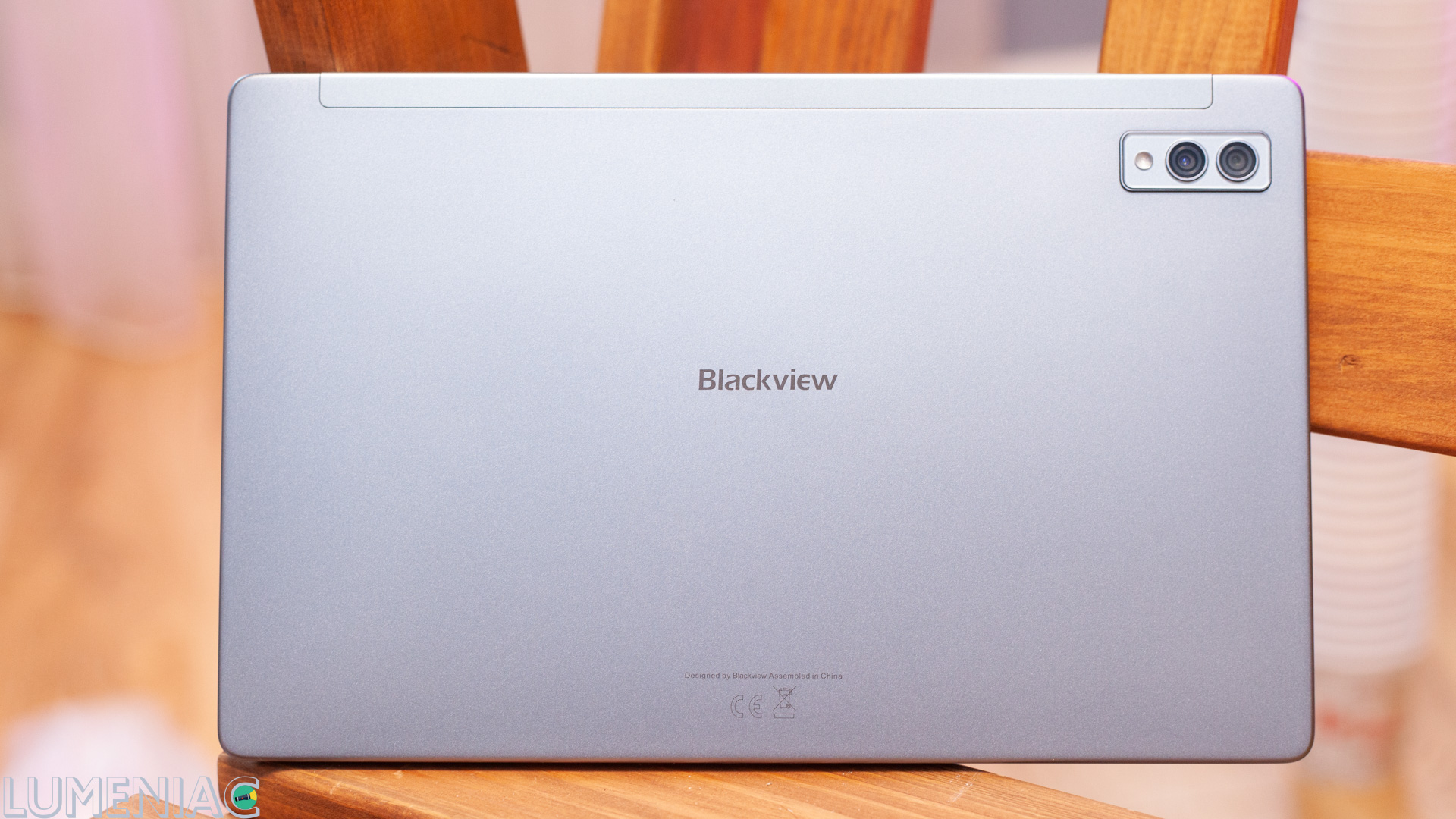 А вот сзади уже видно как-то лучше. Серебристо-серый металлический корпус со слегка закруглёнными гранями, прямоугольный блок камер. Ничего не скрипит, не люфтит — планшет, повторюсь, приятно ощущается в руке и выглядит уже не как очередная бюджетная поделка.