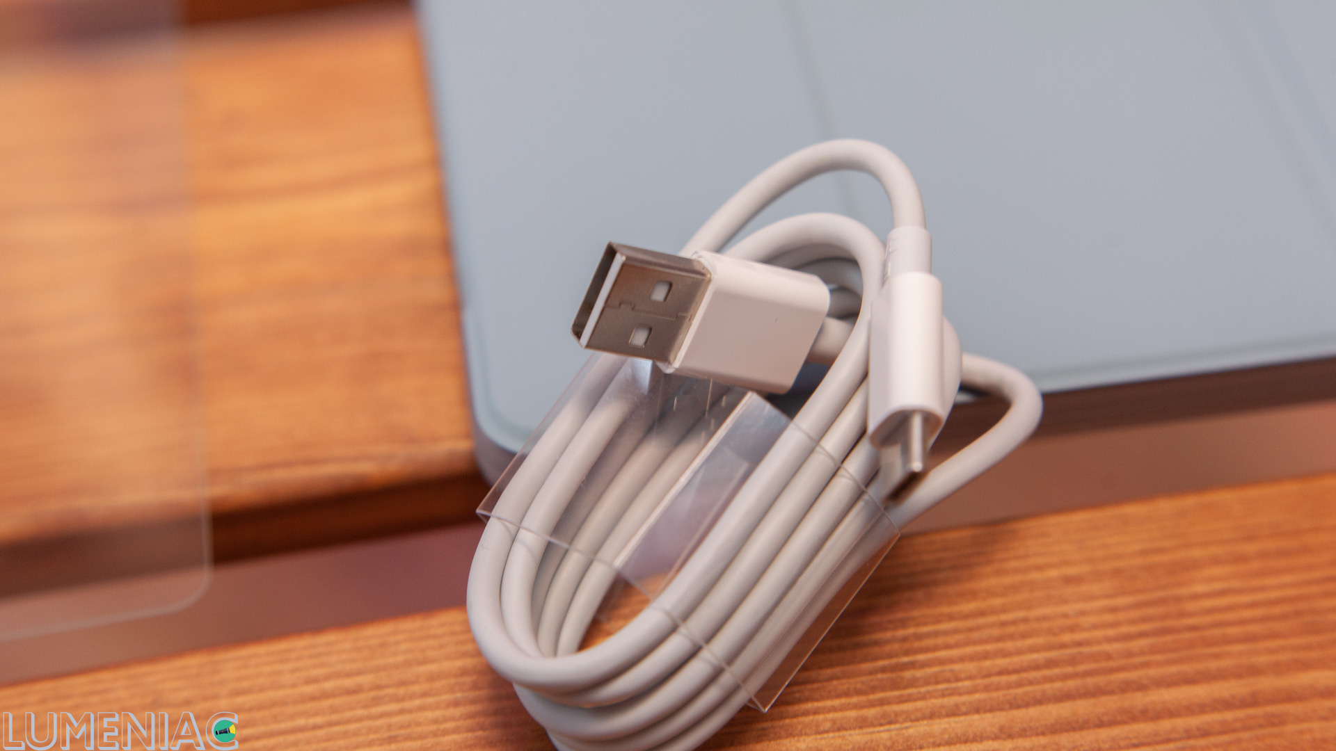 Зарядка на 18Вт, кабель обычный USB-A — USB-C. Впрочем, планшет поддерживает и двусторонний Type-C