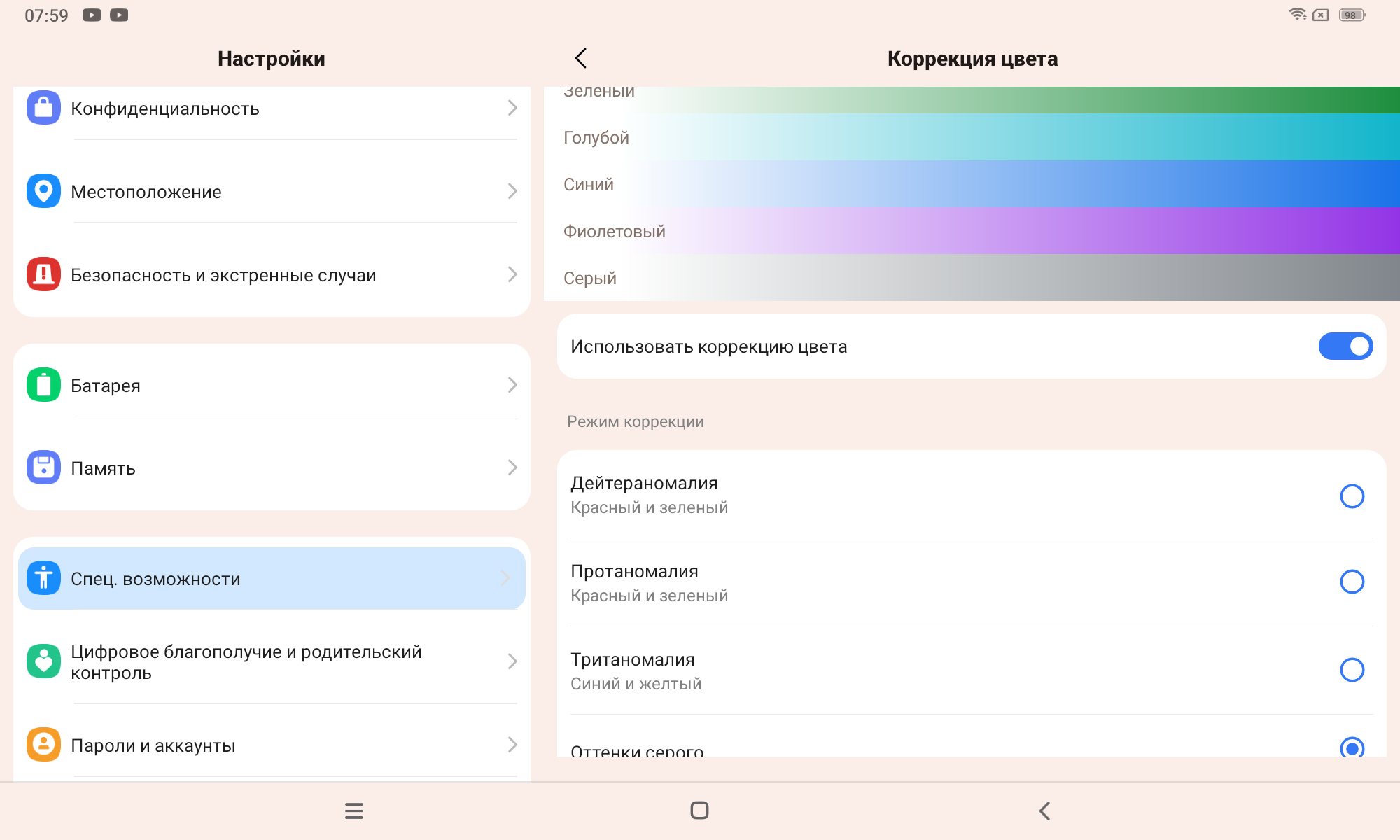 Еще одна интересная особенность — настройка экрана по некоторым нарушениям зрения. Можно вообще сделать в оттенках серого, кстати